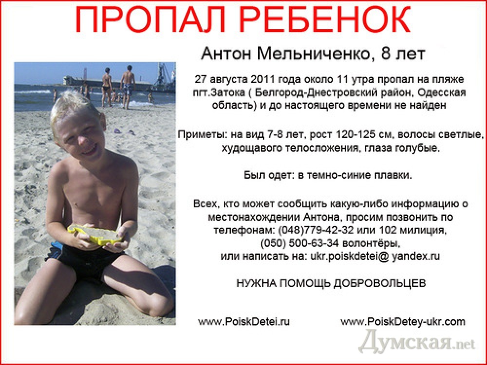 8-летний Антон пропал в августе 2011 года на пляже в поселке Затока Белгород-Днестровского района. 1,5-годовалый Никита пропал 25 марта 2013 года со двора родительского дома в селе Доброалександровка Овидиопольскогой района. Волонтеры и милиция продолжают поиски ребенка. Одна из основных версий – похищение.