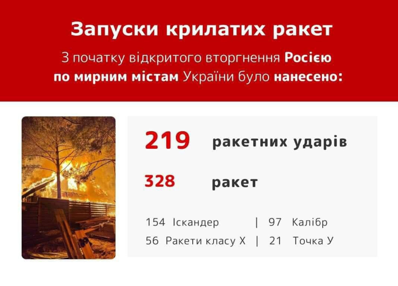 С начала полномасштабного вторжения российские нацисты выпустили по мирным городам и селам Украины 328 оперативно-тактических ракет328 оперативно-тактических ракет наземного и морского базирования типа «Искандер» и «Калибр» выпустили российские нацисты по мирным городам и селам Украины с начала полномасштабного вторжения в нашу страну. Об этом сообщил главнокомандующий Вооруженными силами Украины генерал Валерий Залужный. «Это кровавое преступление путинского режима является вопиющим нарушением норм международного гуманитарного права и требует расследования Гаагского трибунала», — заявил военачальник. СМЕРТЬ РОСІЙСЬКИМ ОКУПАНТАМ! Помітили помилку? Виділяйте слова з помилкою та натискайте control-enter |