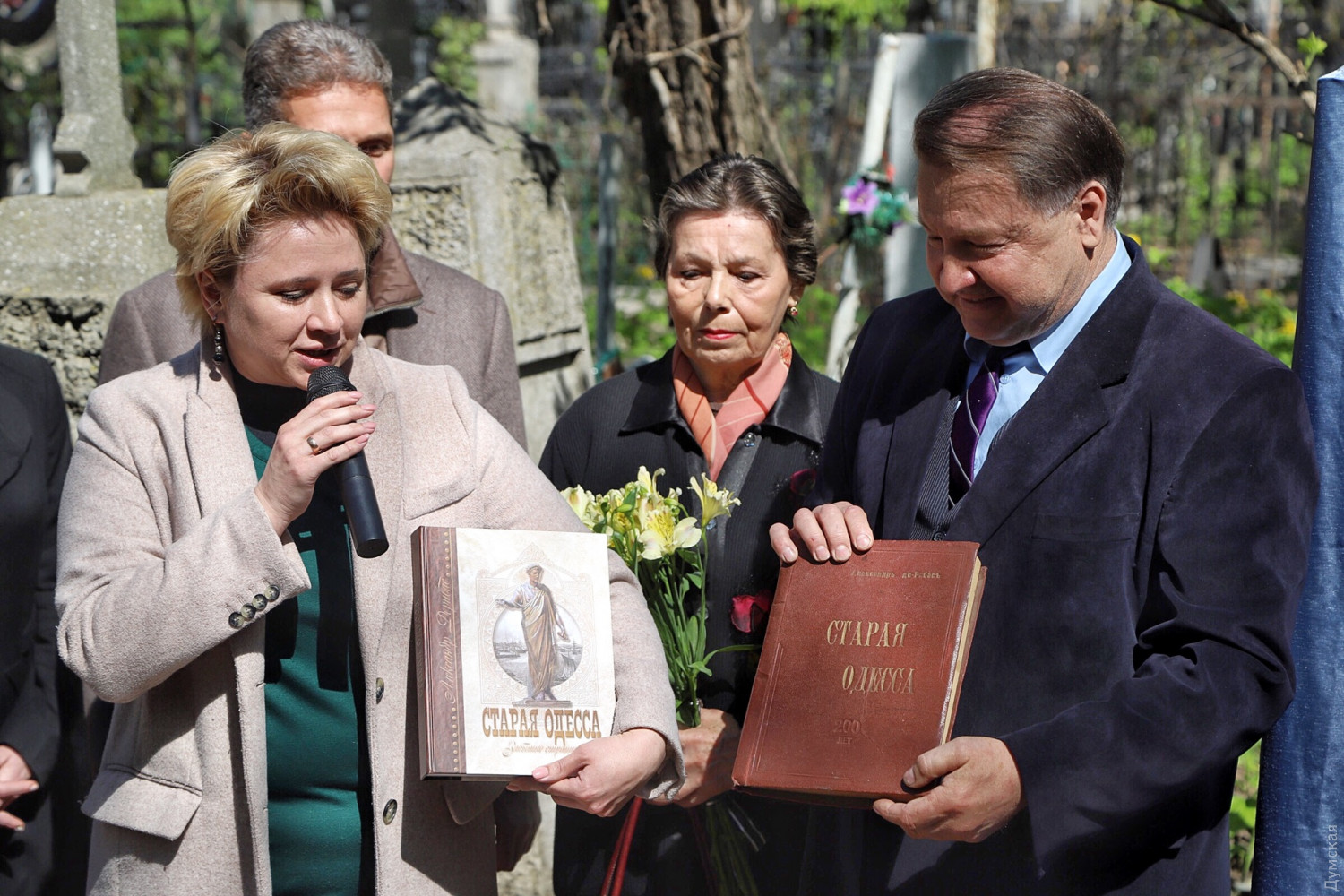С оркестром и книгами: в Одессе открыли памятник потомку Дерибаса и автору «Старой Одессы»Памятник известному одесскому историку, краеведу, библиографу, потомку одного из основателей Одессы Александру Дерибасу открыли сегодня в торжественной обстановке на центральной аллее Второго Христианского кладбища. «Как рассказал «Думской» один из инициаторов установки памятника, режиссер Одесской киностудии Игорь Козлов-Петровский, идея появилась во время съемки документального фильма о прославленных одесситах «Пантеон Одессы». «Наш фильм — это рассказ об известных людях, захороненных на Втором Христианском, — говорит режиссер. — К сожалению, после смерти Александра Михайловича на его могиле не было установлено надгробие. Узнав об этом, кинематографисты и небезразличные одесситы собрали деньги на этот памятник». Главным трудом одессита стала книга «Старая Одесса» — своего рода летопись нашего города. В память об этом на надгробии изобразили книгу. Открытие памятника состоялось под звуки гимна Одессы в исполнении муниципального духового оркестра имени Салика. Александр Михайлович Дерибас родился 31 декабря 1856 года в Одессе. Занимался общественной, издательской, административной деятельностью. Был председателем Одесского литературно-артистического общества, членом Пушкинской комиссии Одесского дома ученых. Работал директором Одесской городской публичной библиотеки, много лет был заведующим ее краеведческим отделом. Умер 2 октября 1937 от сердечного приступа, в момент, когда получил окровавленные личные вещи сына, погибшего в застенках НКВД. Фото — Александр Гиманов/ «Думская» СМЕРТЬ РОСІЙСЬКИМ ОКУПАНТАМ! Помітили помилку? Виділяйте слова з помилкою та натискайте control-enter |