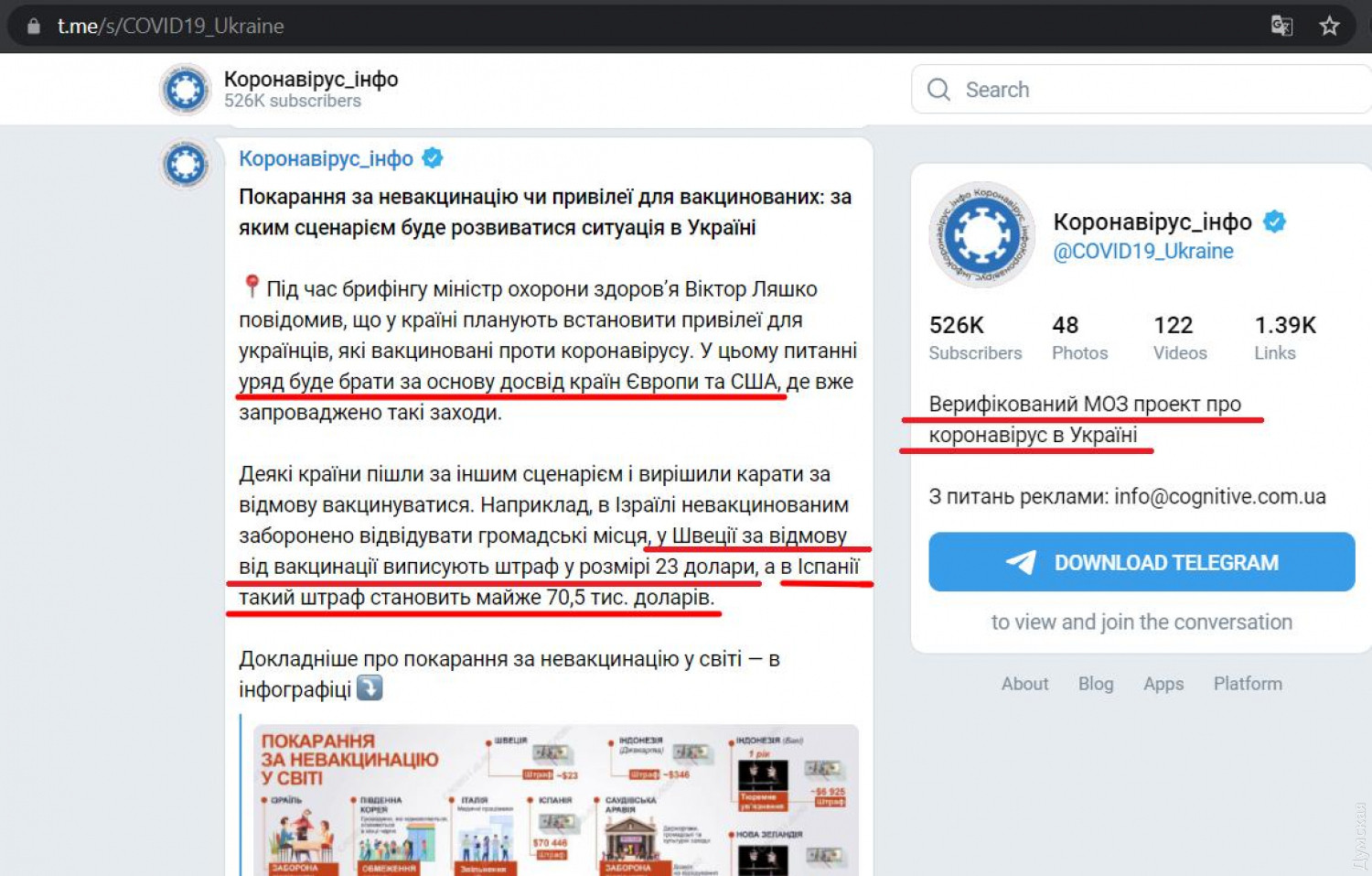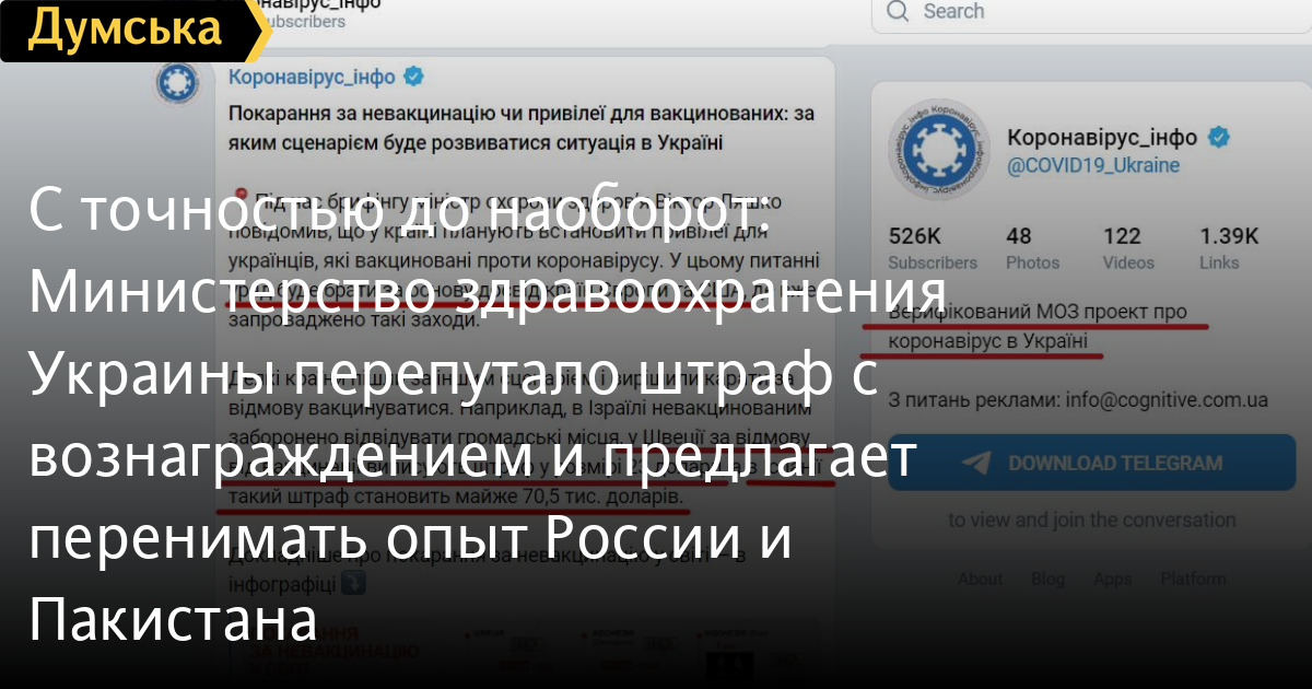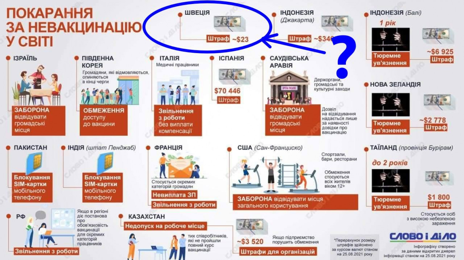 Антифейк С точностью до наоборот: Министерство здравоохранения Украины перепутало штраф с вознаграждением и предлагает перенимать опыт России и ПакистанаПоддержать Виктора Ляшко в его желании давить на тех, кто отказывается прививаться, решил верифицированный Минздравом телеграм-канал «Коронавірус_Інфо». Сегодня там выложили инфографику, в которой собраны примеры «наказаний за невакцинацию в мире». Министр обещал перенимать опыт США и Европы, однако в инфографике упомянуты только Франция, Италия, Испания, Швеция и американский город Сан-Франциско. Остальные примеры касаются стран Азии и Океании, а также России. Большинство из них вряд ли можно назвать эталонами демократии, передовой опыт которых стоит перенимать. Наше внимание привлекло сообщение о том, что в Швеции за отказ от прививок якобы выписывают штраф 23 доллара. Это странно: Швеция уже полтора года является страной с минимальными карантинными ограничениями и лояльным отношением к гражданам. Штраф за отказ от прививки, да еще и на такую смехотворную, по местным меркам, сумму, выглядит очень странно. Мы решили проверить данную информацию и обратились к гражданам Украины, которые живут в этой скандинавской стране. Они удивились новости и подтвердили: вакцинация против коронавируса в Швеции проводится абсолютно добровольно, а ограничения введены разве что для иностранцев, которые пересекают границу. Ни о каких штрафах для «отказников» речи нет и быть здесь не может. Но дыма без огня не бывает. Мы копнули глубже и выяснили: да, действительно, 23 доллара. Но как в старом анекдоте: «Во-первых, не в лотерею, а в карты; во-вторых, не миллион долларов, а пять рублей; в-третьих не выиграл, а проиграл!». Как оказалось, ученые из Лундского университета изучают различные способы стимулирования к вакцинации. Несколько тысяч добровольцев разделили на группы. Первой предоставляют детальную информацию о вакцинах, вторая группа придумывает креативные способы уговорить людей на прививки. Люди из третьей группы составляют список родных и близких, которых они хотят уберечь от коронавируса, а четвертую решили просто подкупить: если они согласятся на прививку, обещают заплатить 200 крон, это как раз 23 доллара по курсу. Впрочем, это не единственный ляп в министерской инфографике. Например, украинцев, которые живут в Испании, сильно удивила информация о том, что за отказ от прививок здесь якобы положен штраф в размере 70 тысяч долларов. Как мы выяснили, в феврале года в провинции Галисия, действительно, внесли изменения в местный закон и предусмотрели штрафы от 3 до 60 тысяч евро за отказ от прививки. Однако уже 30 марта генеральный прокурор Испании от имени премьер-министра обжаловал это решение: по мнению центральной власти, это явное злоупотребление и превышение полномочий. И пока конституционный суд Испании рассматривает это дело, судьи единогласно решили приостановить действие данного закона. Так что - нет никаких штрафов для непривитых ни в Галисии, ни во всем Королевстве Испания. Более того, испанский минздрав отказывается вводить обязательную вакцинацию для медицинских и социальных работников — это не только незаконно, но и противоречит принятой в стране стратегии добровольности. По всей видимости, в инфографике немало таких сомнительных моментов. Например, здесь указано, что в ст