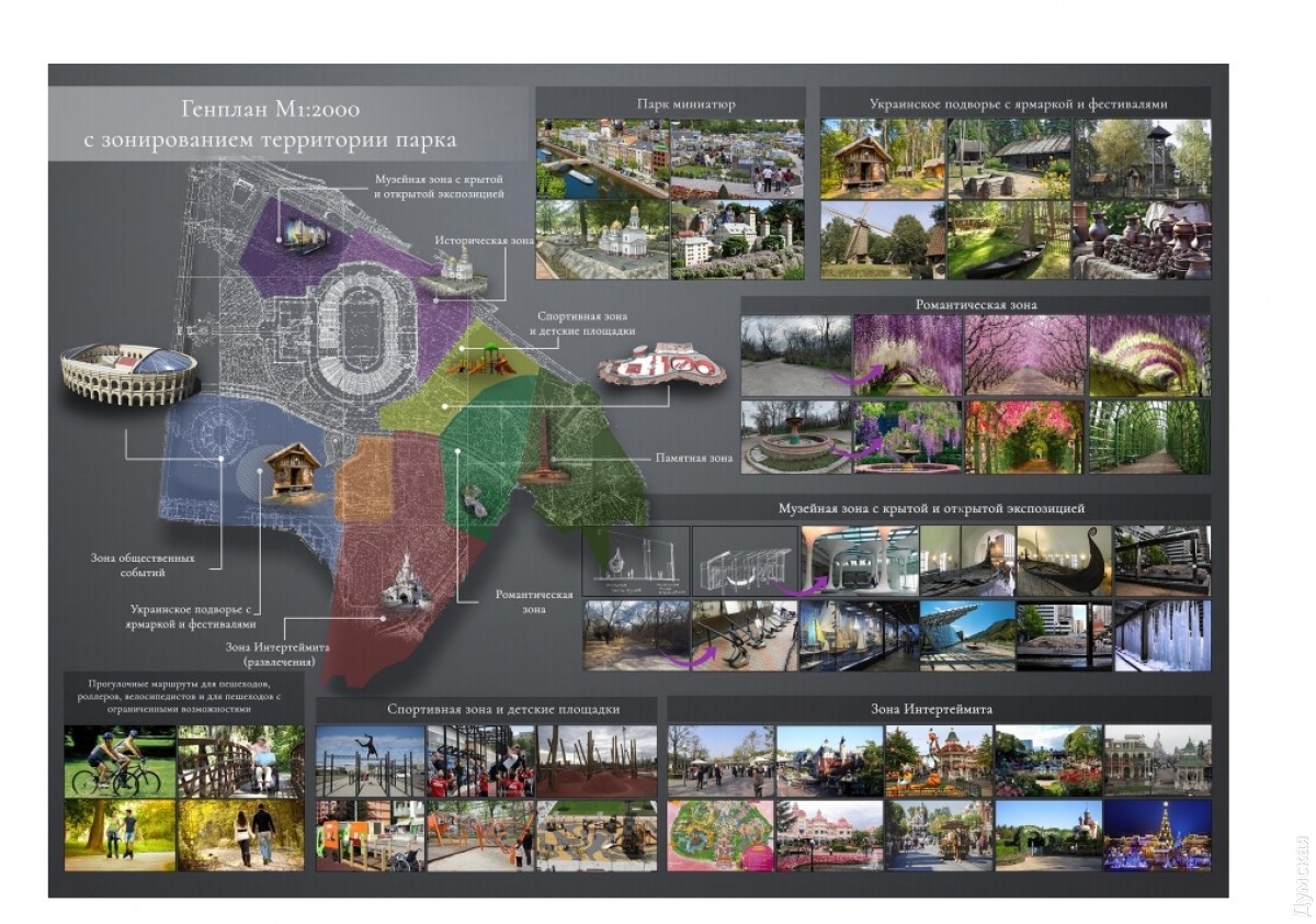 Как по мне, но ничего « архитектурного» лепить в парке не нужно! Нужно всего лишь привести в порядок дорожки, мне например нравится ландшафт возле стадиона Черноморец, а в парке восстановить то, что было и привести в порядок зеленую зону, что бы не было джунглей не проходимых и фонари с лавочками поставить, да пожалуй и все, для меня парк был всегда возможностью обстрагироваться от городской суеты, покататься с дочкой на роликах, возле стадиона это можно сделать, там хороший асфальт, а дальше глушь, можно средь бела дня наткнуться на человеческие сожженые останки) Хочется просто хороший чистый и цивилизованный парк, без каких либо зданий, кафе , шаурмы и прочей хрени, никаких развлекательных центров, дильфинариев, цирков, аттракционов, ничего, неужели нельзя сделать просто огромный, зеленый парк! В котором можно бродить по гравийными дорожкам, вдыхать благоухающий летними ароматами воздух, посидеть на травке в тени, ну или на лавочке, где будет много урн и никаких собак с их гавном которое никто не убирает!