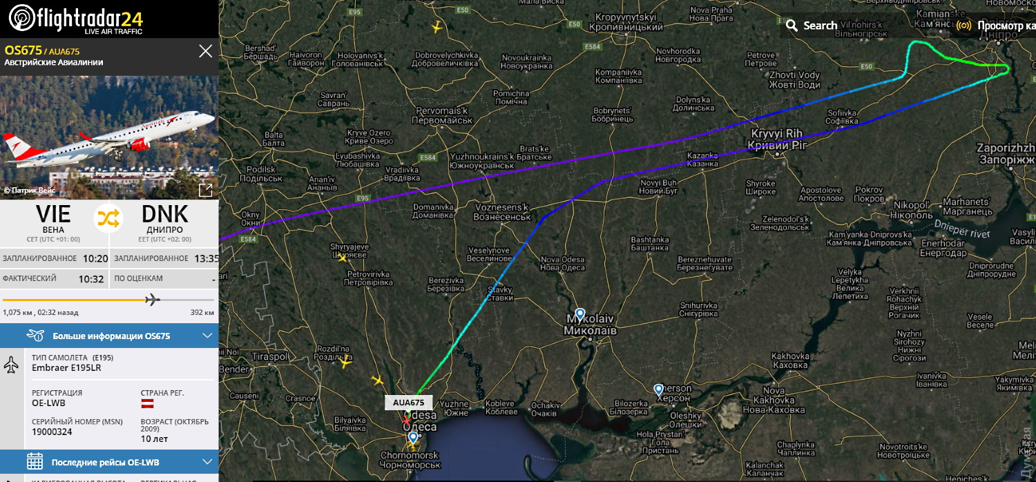 Около часа назад самолет авиакомпании «Австрийские авилинии» совершил вынужденную посадку в Международном аэропорту «Одесса». «Эмбрайер» летел по маршруту Вена — Днепр, но не смог там приземлиться.