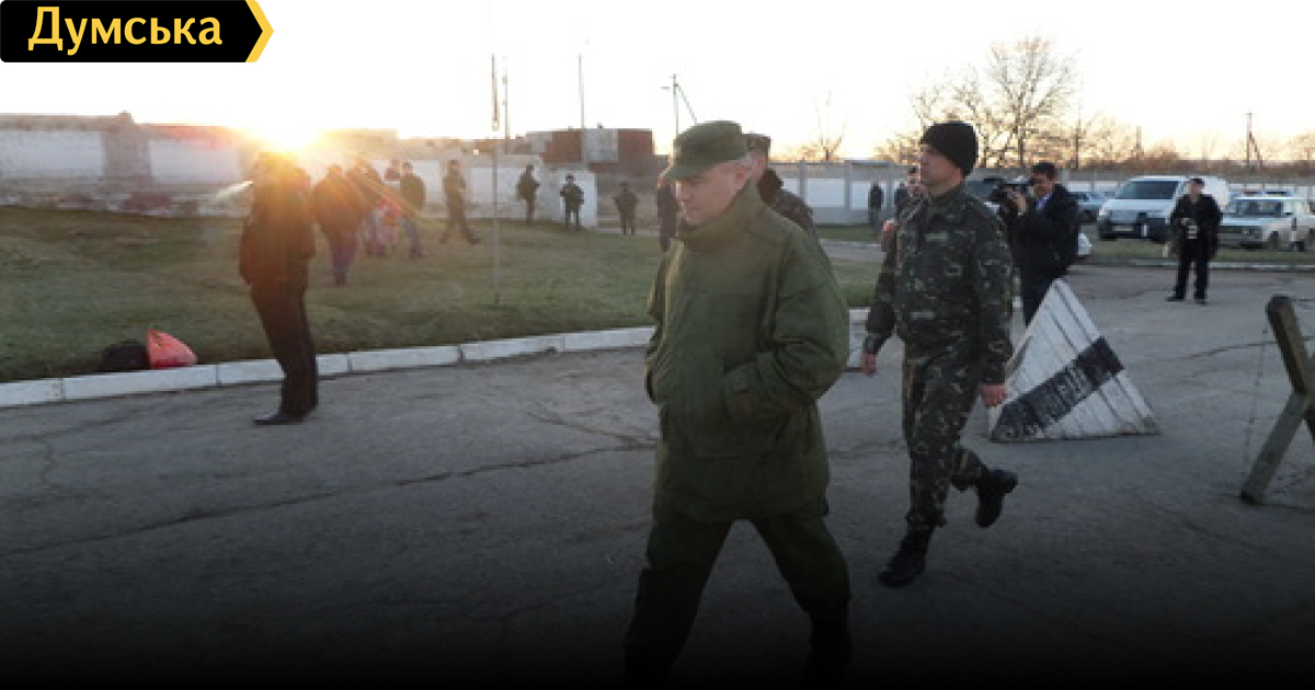 «На фото, сделанном мной 3 марта у КПП украинской воинской части в поселке Перевальное, он одет в ту же форму, что и солдаты. Погоны и нашивки сняты, но российская кокарда на головном уборе присутствует», — отмечает журналист.