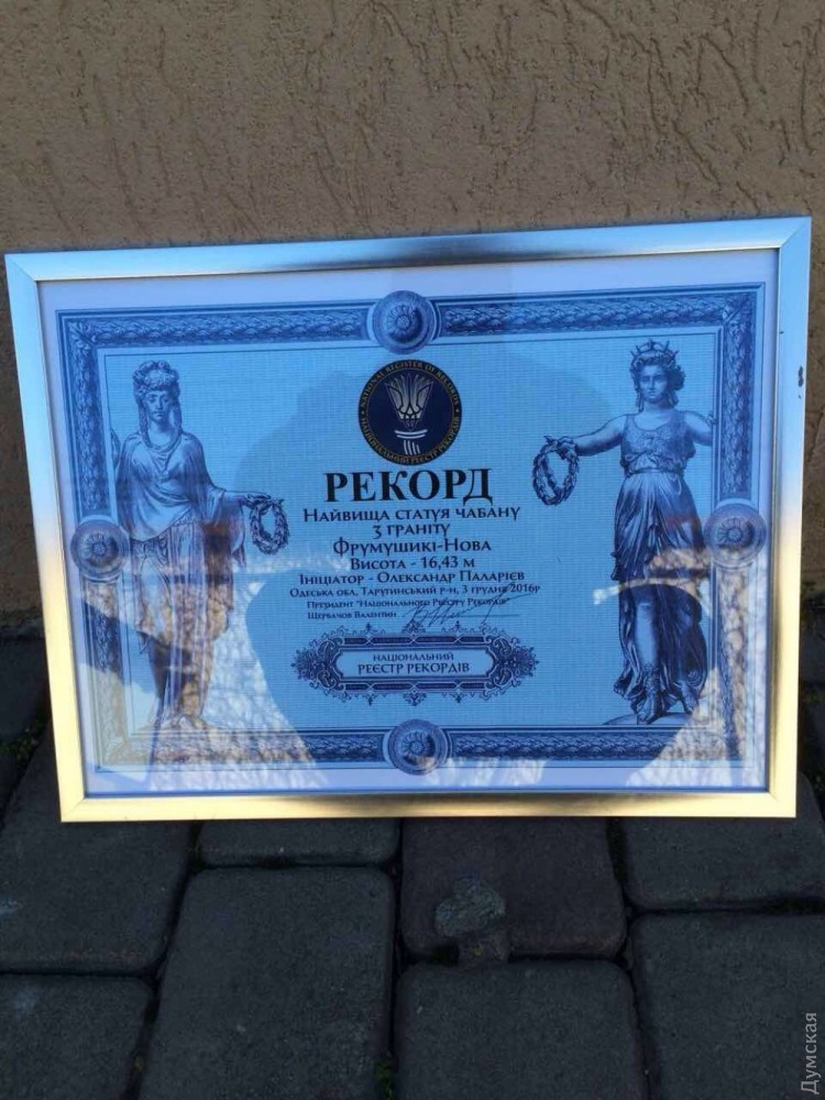 Исполинский памятник чабану в Одесской области внесли в украинскую книгу рекордовСамый большой гранитный памятник планеты, установленный на территории этнографического комплекса «Фрумушика-Нова» в Тарутинском районе Одесской области, официально внесли в Национальный реестр рекордов Украины. Как передает корреспондент «Думской», торжественная церемония прошла вчера. Представители Национального рекорда лично убедились в параметрах изваяния и выдали соответствующее свидетельство. По словам владельца комплекса и крупнейшей в Европе овцеводческой фермы Александра Палариева, которому и принадлежит идея установки исполинской скульптуры, высота памятника официально составила 16 метров 43 сантиметра (17,93 м с постаментом). Вес всей конструкции – 1080 тонн. По словам Александра сейчас заканчивается процесс шлифовки гранитного чабана, после чего в его подножие вмонтируют специальную табличку-свидетельство, подтверждающую регистрацию рекорда. Ближе к весне территорию вокруг изваяния засеют степными растениями, присущими этому региону. Не исключено также, что Тарутинский район посетят представители Книги рекордов Гиннеса. Ранее самым большим изваянием планеты из гранита считался 144-тонный Ленин в российском Петрозаводске. СМЕРТЬ РОСІЙСЬКИМ ОКУПАНТАМ! Помітили помилку? Виділяйте слова з помилкою та натискайте control-enter |
