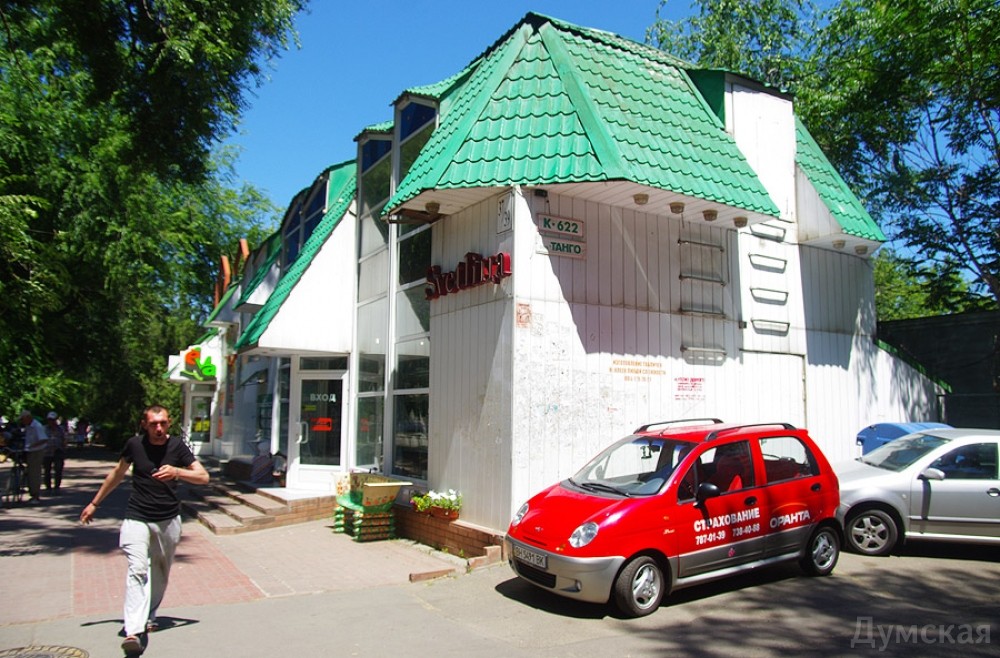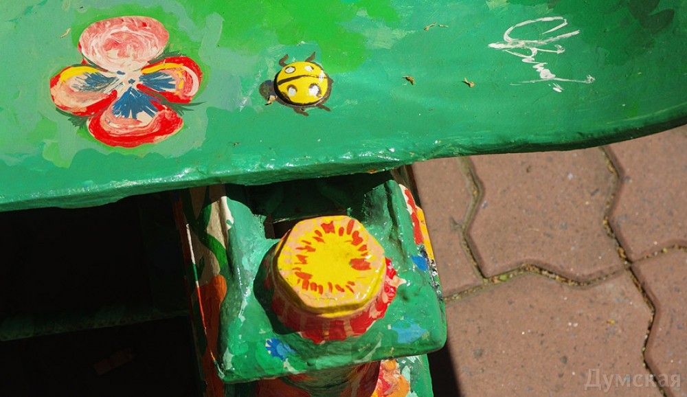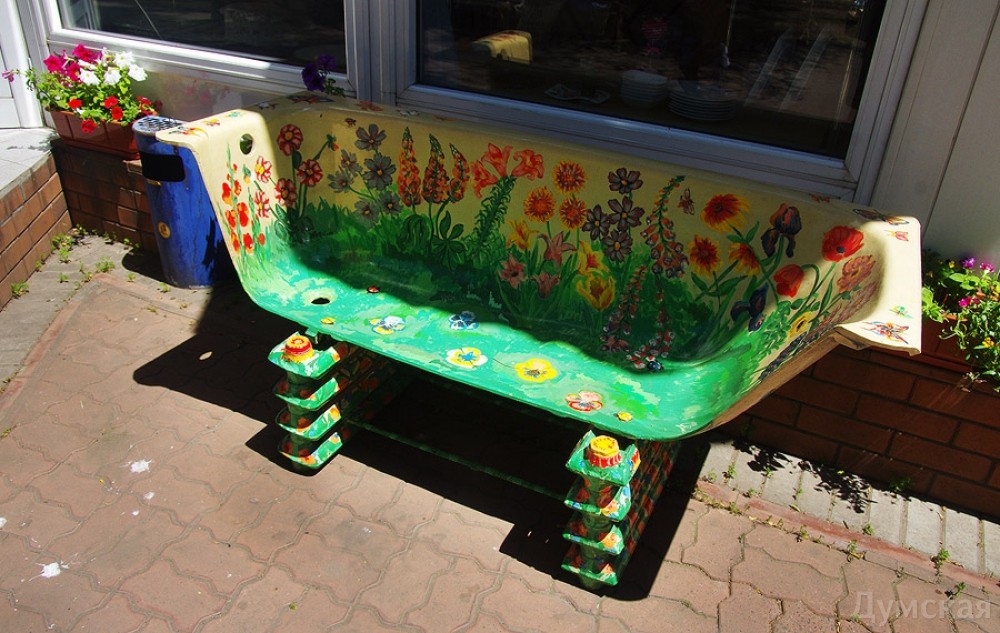 Один из магазинчиков на 6-й Фонтана заманивает клиентов не только чудесной архитектурой из пластиковой вагонки, но и необычной сантехнической скамейкой, сотворенной из старой ванны, пары чугунных батарей и неуемного таланта художника-оформителя.