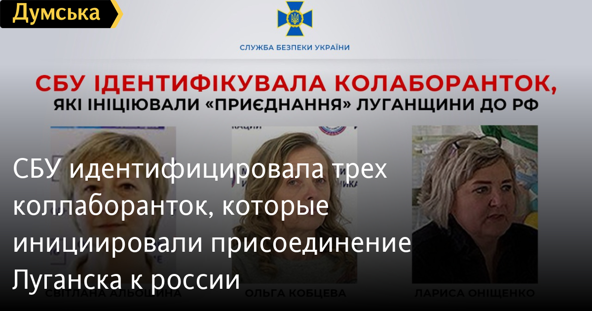 СБУ идентифицировала трех коллаборанток, которые инициировали «присоединение» Луганска к россииСлужба безопасности Украины установила личности трех «чиновниц» так называемой «луганской народной республики», которые занимались организацией процесса «интеграции» марионеточного формирования в состав рф. В СБУ сообщили, что это «депутаты» так называемого «народного совета лнр» Светлана Алешина и Ольга Кобцева, а также Лариса Онищенко, которая до полномасштабной войны представляла «лнр» в рамках Трехсторонней контактной группы. Установлено, что именно они подготовили «нормативную базу» включения региона в россию и в сентябре направили главе «республики» леониду пасечнику обращение с просьбой срочно провести референдум о присоединении области к рф. Женщины сотрудничают с российскими оккупантами еще с 2014 года. Их деятельность квалифицировали по статьям 111-1 и 110 Уголовного кодекса Украины (коллаборационизм, посягательство на территориальную целостность и неприкосновенность Украины). Сейчас фигурантки продолжают скрываться от украинского правосудия на временно оккупированных территориях. СМЕРТЬ РОССИЙСКИМ ОККУПАНТАМ! Заметили ошибку? Выделяйте слова с ошибкой и нажимайте control-enter |