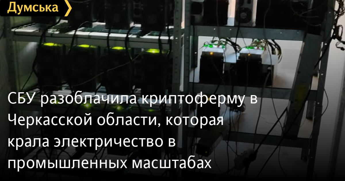 СБУ разоблачила криптоферму в Черкасской области, которая крала электричество в промышленных масштабахСлужба безопасности Украины разоблачила в Черкасской области крупную подпольную криптоферму, которая для майнинга биткоинов похищала электроэнергию в промышленных масштабах. Как сообщила пресс-служба СБУ, по предварительным оценкам специалистов, дельцы нанесли ущерб государству на сумму более шести миллионов гривен. Похищенной электроэнергии хватило бы для освещения более десятка квартир в течение нескольких лет. Сотрудники СБУ выяснили, что подпольную криптоферму организовали местные предприниматели. В арендованных складских помещениях они несанкционированно подключили оборудование к электросетям ОАО «Черкассыоблэнерго». В ходе проведения следственных действий правоохранители обнаружили «производственные» мощности подпольной криптофермы и другие доказательства незаконной деятельности. Открыто уголовное производство по ч. 2 ст. 188-1 (похищение воды, электрической или тепловой энергии путем ее самовольного использования) УК Украины. СМЕРТЬ РОССИЙСКИМ ОККУПАНТАМ! Заметили ошибку? Выделяйте слова с ошибкой и нажимайте control-enter |