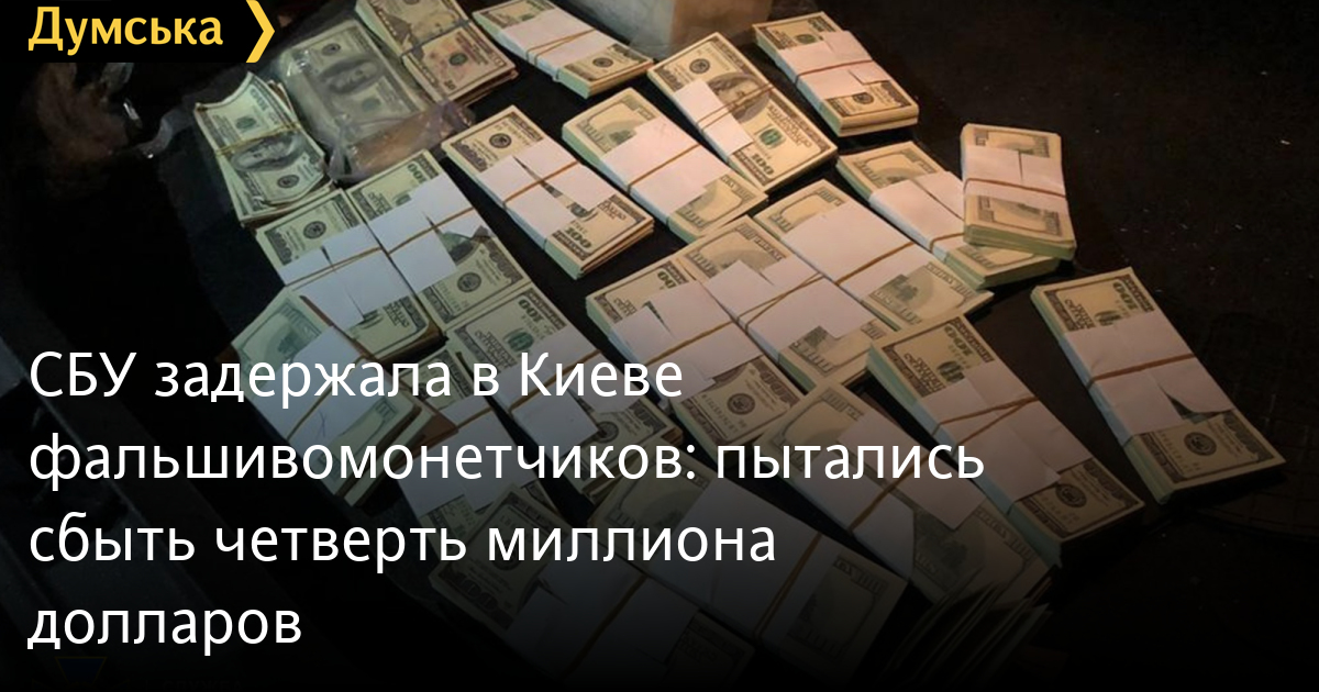 СБУ задержала в Киеве фальшивомонетчиков: пытались сбыть четверть миллиона долларовСотрудники Службы безопасности заблокировали мощный канал сбыта поддельной иностранной валюты. Как сообщила пресс-служба СБУ, во время спецоперации в Киеве правоохранители задержали двух организаторов группировки фальшивомонетчиков. Они пытались сбыть 240 тысяч поддельных долларов. Банкноты были высокого качества. Их фальшивость не распознавали большинство технических средств проверки. Дельцы предлагали подделку по цене 50-60% от стоимости номинала. Для сокрытия противоправной деятельности злоумышленники сбывали их отдельными траншами в несколько этапов. Злоумышленникам уже сообщили о подозрении. Сейчас решается вопрос об избрании им меры пресечения. СМЕРТЬ РОССИЙСКИМ ОККУПАНТАМ! Заметили ошибку? Выделяйте слова с ошибкой и нажимайте control-enter Новости по этой теме: 12 января 2022: Харьковские станции метро ожидает масштабная проверка: в вестибюле подземки на площади Конституции рухнул потолок (фото) 8 января 2022: В Одессе из офиса фирмы выкрали сейф с внушительной суммой денег, золотом и пистолетом 27 декабря 2021: В лесополосе под Киевом нашли тело главврача из Ровенской области: по подозрению в убийстве задержаны таксист с приятелем 23 декабря 2021: В Киеве задержали подозреваемых мошенников, которые обманывали на свиданиях мужчин ради денег |