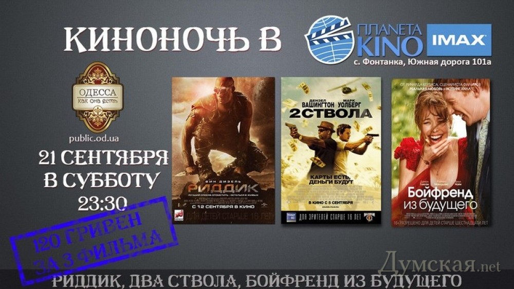 Мероприятие проводится пабликом «Одесса как она есть». Как сообщают организаторы, зрители увидят фильмы «Риддик», «Два ствола» и «Бойфренд из будущего».