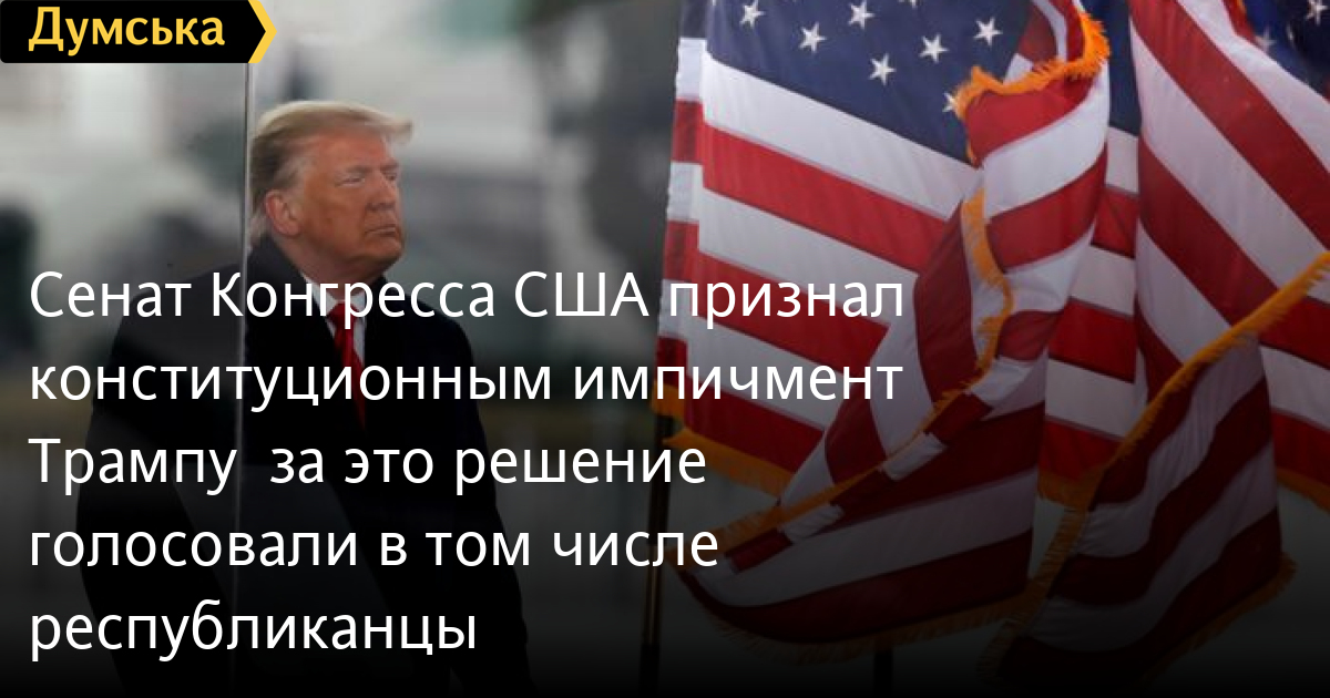 Сенат Конгресса США признал конституционным импичмент Трампу – за это решение голосовали в том числе республиканцыСенат США проголосовал за то, что процедура импичмента в отношении уже бывшего президента Дональда Трампа не противоречит американской конституции. За то, что процедура является конституционной, проголосовали 56 сенаторов, против были 44, сообщает The Washington Post. Отмечается, что впервые в истории страны эта процедура начата в отношении бывшего президента. Сегодня слушания по импичменту продолжатся. Трампу могут запретить занимать в будущем государственные должности, в том числе баллотироваться на пост президента. При этом решение еще не означает, что сенаторы впоследствии проголосуют за сам импичмент Трампа — для этого требуется 67 голосов. СМЕРТЬ РОССИЙСКИМ ОККУПАНТАМ! Заметили ошибку? Выделяйте слова с ошибкой и нажимайте control-enter Новости по этой теме: 19 января 2022: Госсекретарь США Блинкен прибыл в Украину 18 января 2022: Украину посетил директор ЦРУ, — CNN 28 декабря 2021: В оборонном бюджете США предусмотрели 300 млн долларов для Украины: Байден подписал документ 2 сентября 2021: Из-за урагана "Ида" в Нью-Йорке объявили чрезвычайное положение |
