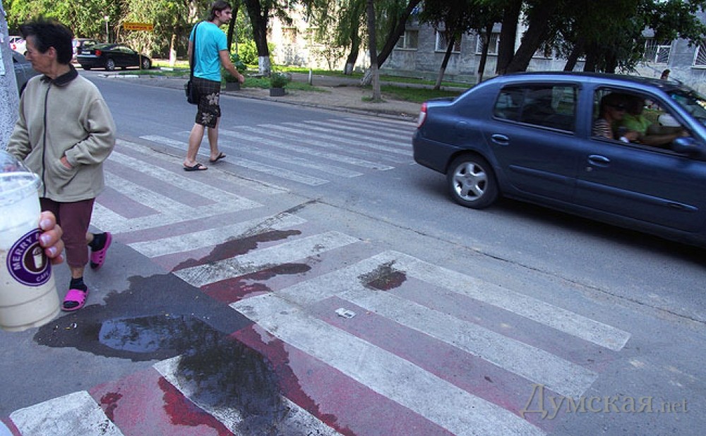 УТОЧНЕНИЕ: В дирекции КП «Специализированное монтажно-эксплуатационное подразделение» (CМЭП) «Думскую» заверили, что к этой разметке предприятие отношения не имеет. «Мы рисуем всегда по ГОСТу. Эта «зебра» явно незаконная, никаких документов на нее нет», — отметил представитель КП. Он предположил, что чудо-«зебру» нарисовали работники супермаркета.