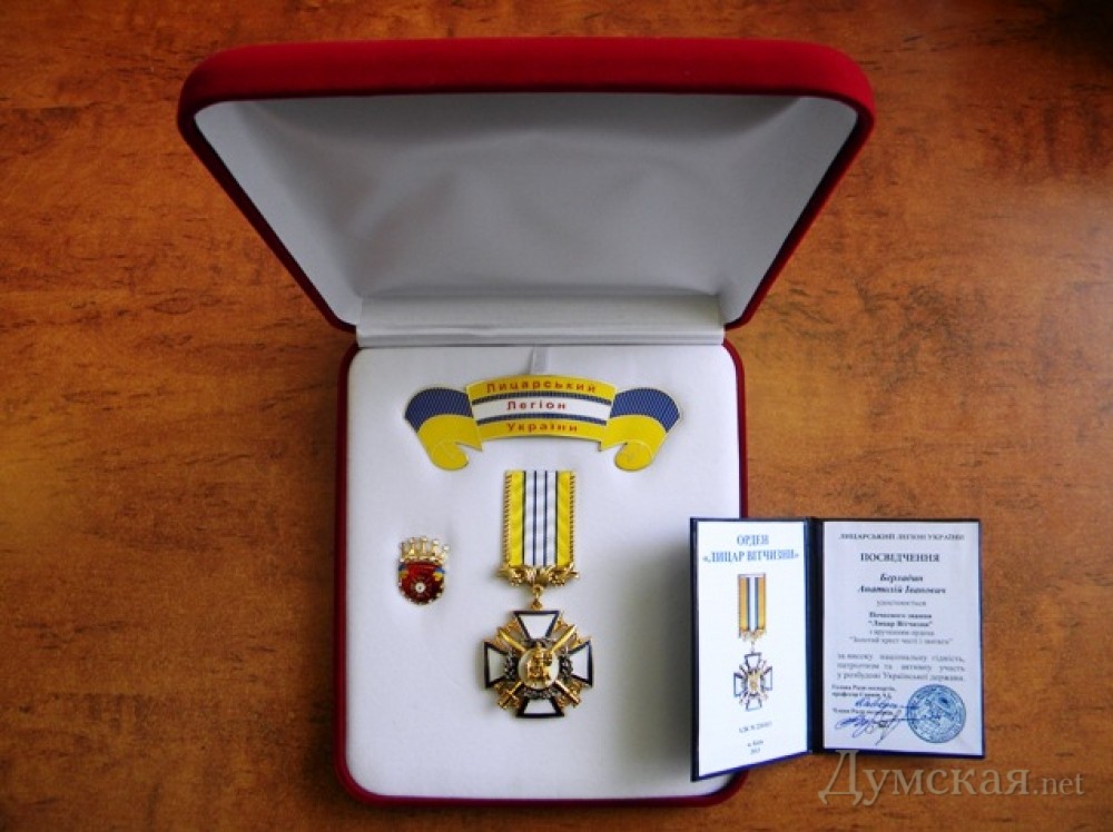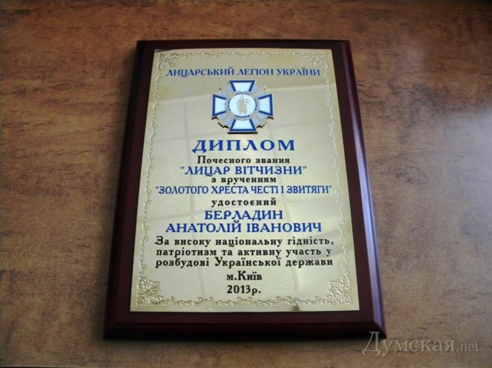 Анатолий Берладин отмечен за «добросовестное служение Отечеству, высокое соответствие Кодексу рыцарской чести, утверждение в Украинском обществе самых высоких общечеловеческих ценностей». В частности заслуги новоиспеченного рыцаря отметили в фискальной сфере, возглавляемое им предприятие стало лидером региона по перечисляемым налогам, за 2012 год - 120 миллионов гривен. Начальников всех рангов делает рыцарями мутная контора «международная общественная организация» под названием «Ассамблея деловых кругов» (АДК). Естественно, не бесплатно, а за большие деньги – от 16,5 тыс. грн. Ранее из видных одесситов «сэром» стал бывший губернатор Николай Сердюк.