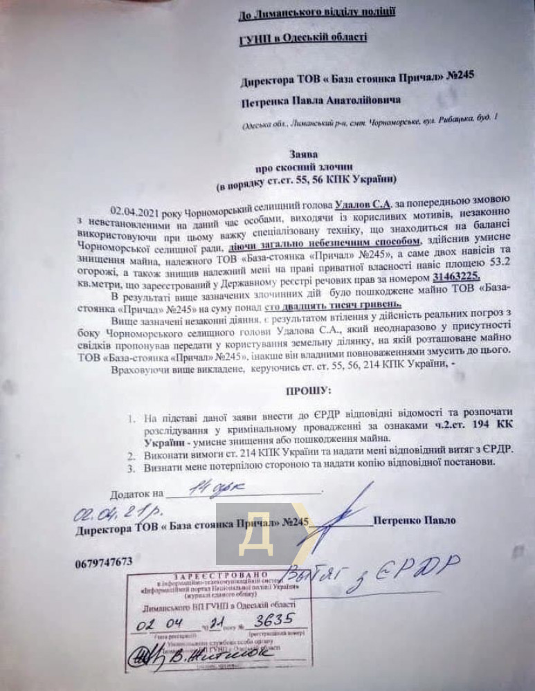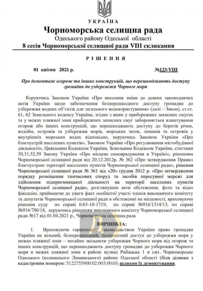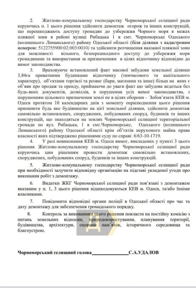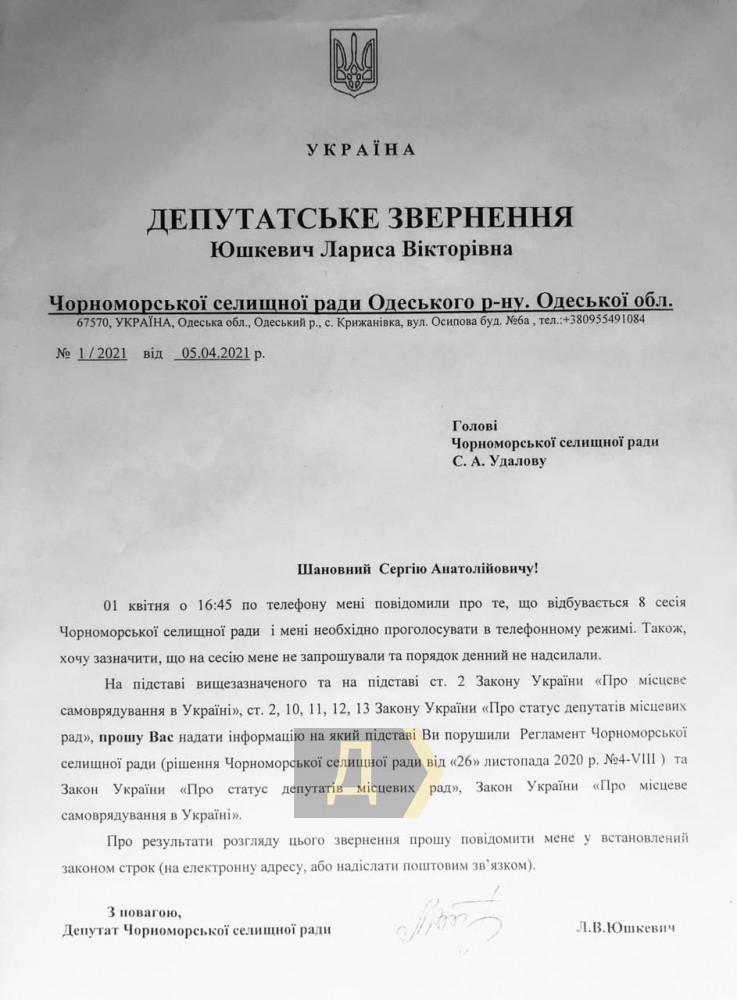 Необычную сессию провел 1 апреля местный совет пгт. Черноморское, что под Одессой. Несколько депутатов утверждают, что секретарь сельсовета Юлия Плешко провела внеочередное заседание в телефонном режиме. В распоряжении «Думской» оказалась запись телефонного разговора, в котором секретарь спрашивает у одной из депутаток, как она хочет проголосовать за проект решения о сносе строений, перекрывающих доступ к морю – за или против, а также поясняет, что в телефонном режиме голосовали еще несколько депутатов. Интересно, что регламентом не предусмотрена такая форма волеизъявления народных избранников, а на вопрос, с чем связана срочность, Плешко ответила, что к такой форме голосования поссовет вынужден прибегнуть из-за форс-мажорных обстоятельств. Пытаясь разобраться в произошедшем, корреспондент «Думской» отправился в Черноморское. Оказалось, что под прикрытием первоапрельского решения собирались провести демонтаж капитальных сооружений на земельном участке, принадлежащем Министерству обороны Украины. Утром 2 апреля на побережье выехала тяжелая строительная техника, которая начала сносить спасательную станцию. Однако завершить начатое не удалось — технику остановили, ущерб составил более 120 тысяч гривен, а правоохранительные органы открыли уголовное производство. Местные жители рассказали, что двухэтажный эллинг спасателей со всей инфраструктурой несколько лет назад военные передали в пользование кооператива рыбаков-любителей «Черноморский дельфин». Председатель кооператива, участник боевых действий Вадим Громов, пояснил, что председатель Черноморского сельского совета Сергей Удалов уже несколько лет под разными предлогами пытается захватить этот пляж, спасательную станцию и причал Министерства обороны. «Мы уже несколько лет ведем борьбу с господином Удаловым, отстаивая свои курени, построенные здесь много лет назад. Среди рыбаков много бывших военнослужащих, ветеранов, у нас есть все необходимые документы. Министерство обороны владеет этой землей, есть акты передачи нам спасательной станции, есть решения судов, но Удалов думает, что может отжать этот участок у военных, — рассказывает Громов. – Кроме спасательной станции, на территории базы рыбаков также находится три десятка строений, принадлежащих непосредственно министерству, где в сезон отдыхают военнослужащие, ветераны и участники боевых действий АТО и ООС». Оказалось, что спасательная станция, которую пытался снести поселковый совет, является важным объектом морской инфраструктуры. Это единственная станция на побережье от Лузановки до Коблево, сертифицированная по самой высокой, пятой, категории, откуда может выйти катер на спасение людей. Рыбаки подтверждают, что здесь дежурят специалисты, включая водолазов, а каждое лето спасают с десяток унесенных на матрасах в открытое море людей. Станция поддерживается в хорошем состоянии, что подтверждается актами ежегодных проверок. Здесь же расположен пограничный участок отряда «Южный». По поводу обстоятельств созыва сессии, депутат поссовета Лариса Юшкевич отправила запрос с требованием прояснить, с чем связана срочность ситуации. Ответа пока не поступило, однако «Думской» удалось выяснить подробности. Как оказалось, 22 февраля этого года Лиманская районная администрация своим распоряжением 22/