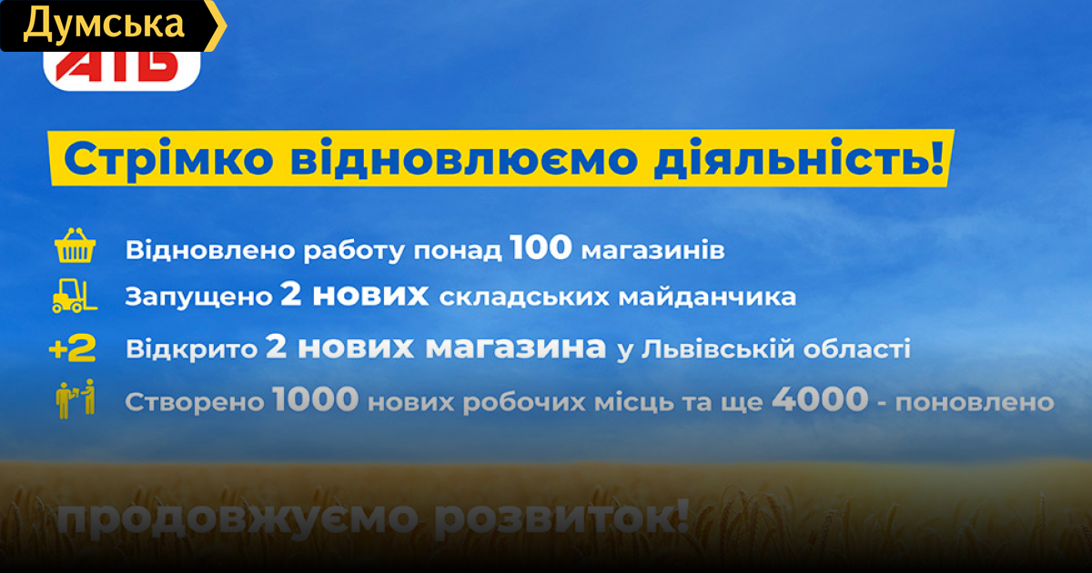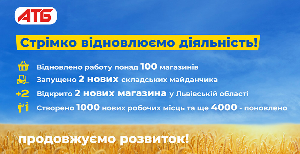 Сеть «АТБ» быстро возобновляет деятельность на мирных и безопасных территориях (новости компаний)Крупнейшая национальная торговая сеть «АТБ» быстро возобновляет деятельность на безопасных и освобожденных от оккупантов территориях Украины, а также, несмотря на войну, развивается для поддержания экономической активности и занятости населения в стране. Сеть запускает работу новых распределительных центров и готовит открытие новых магазинов в мирных регионах, в частности, во Львове, Ужгороде и Черновцах. «Основные усилия компании направлены на возобновление работы временно закрытых магазинов, запуск новых складских и логистических площадок, открытие новых торговых объектов и создание новых рабочих мест для украинцев», – сообщили в пресс-службе АТБ. Компания демонстрирует множество примеров быстрого обновления и развития. В освобожденных от оккупантов местностях Киевской, Черниговской, Сумской и Харьковской областей возобновлена работа более ста магазинов. Так что общая численность работающих по всей территории страны магазинов «АТБ» достигла уже почти тысячи. Компания не осуществляет деятельность только на временно оккупированных территориях. Несмотря на войну и сложность ведения бизнеса в военное время, было открыто два новых магазина на мирной Львовщине – в городах Буск и Золочев. Также «АТБ» инвестирует в развитие своей логистически-складской инфраструктуры для непрерывного обеспечения украинцев широчайшим ассортиментом товаров. «Начали работу две новые складские площадки, которые обеспечат складскую и транспортную логистику для западного, северного и центрального регионов страны. Готовится запуск нового распределительного центра в Киевской области общей площадью 14 тыс. квадратов», – сообщили в корпорации «АТБ», которая сейчас имеет восемь распределительных центров. Расширение деятельности и возобновление работы магазинов позволило компании «АТБ», команда которой объединяет более 60 тысяч украинцев, создать в сложное для экономики и занятости населения военное время дополнительно около тысячи новых рабочих мест. Кроме того, еще около четырех тысяч сотрудников вернулись к работе. Как заявили в «АТБ», компания планирует и дальше расширять свою деятельность: в ближайшее время возобновит работу более 50 супермаркетов в Киеве, столичном регионе и на Черниговщине, откроет семь новых магазинов в западном регионе страны, прежде всего во Львове, Ужгороде и Черновцах. А расширение деятельности АТБ позволит создать еще сотни новых и восстановить тысячи рабочих мест для украинцев. С начала полномасштабной российской военной агрессии на территории Украины корпорация «АТБ» предоставила украинцам гуманитарной помощи на сумму почти 200 миллионов гривен, которые были направлены на помощь мирным жителям в зонах боевых действий или во время эвакуации, медицинским учреждениям, волонтерским организациям и приютам для беженцев. В рамках реализации корпорацией «АТБ» национального проекта по сбору в своих магазинах для подразделений Вооруженных сил Украины и ТрО гуманитарной помощи, продуктов и экипировки защитникам Украины передано более 100 тонн жизненно важных грузов, которые команда сети часто доставляет самостоятельно в места, где в этом больше всего нуждаются. С начала войны «АТБ» работает в усиленно