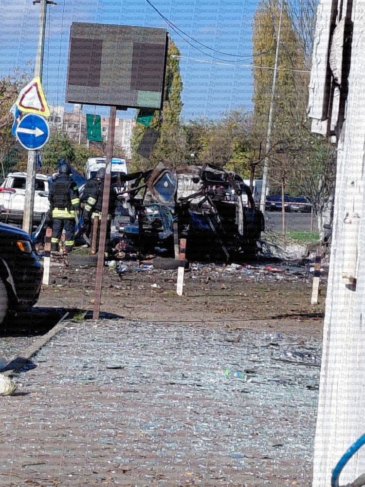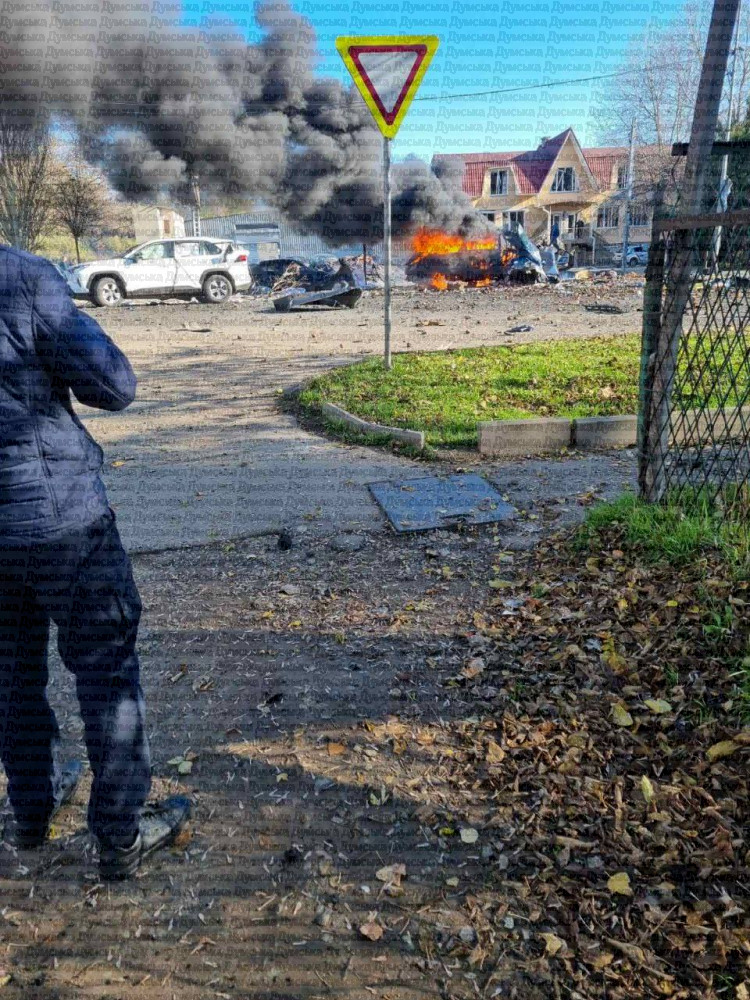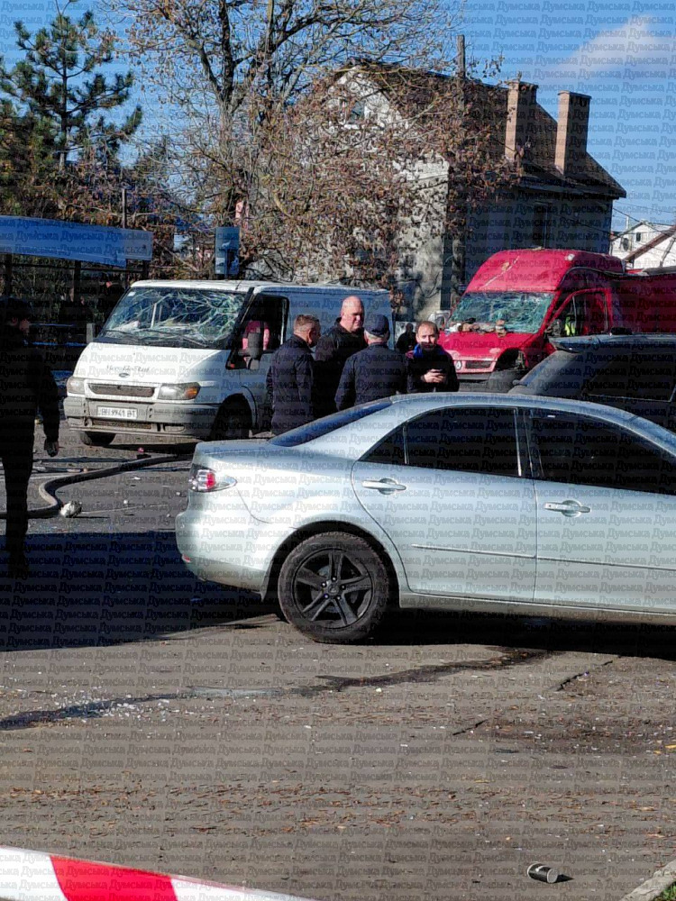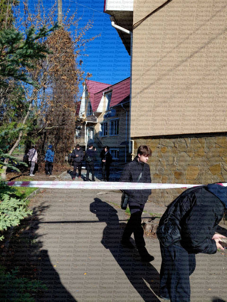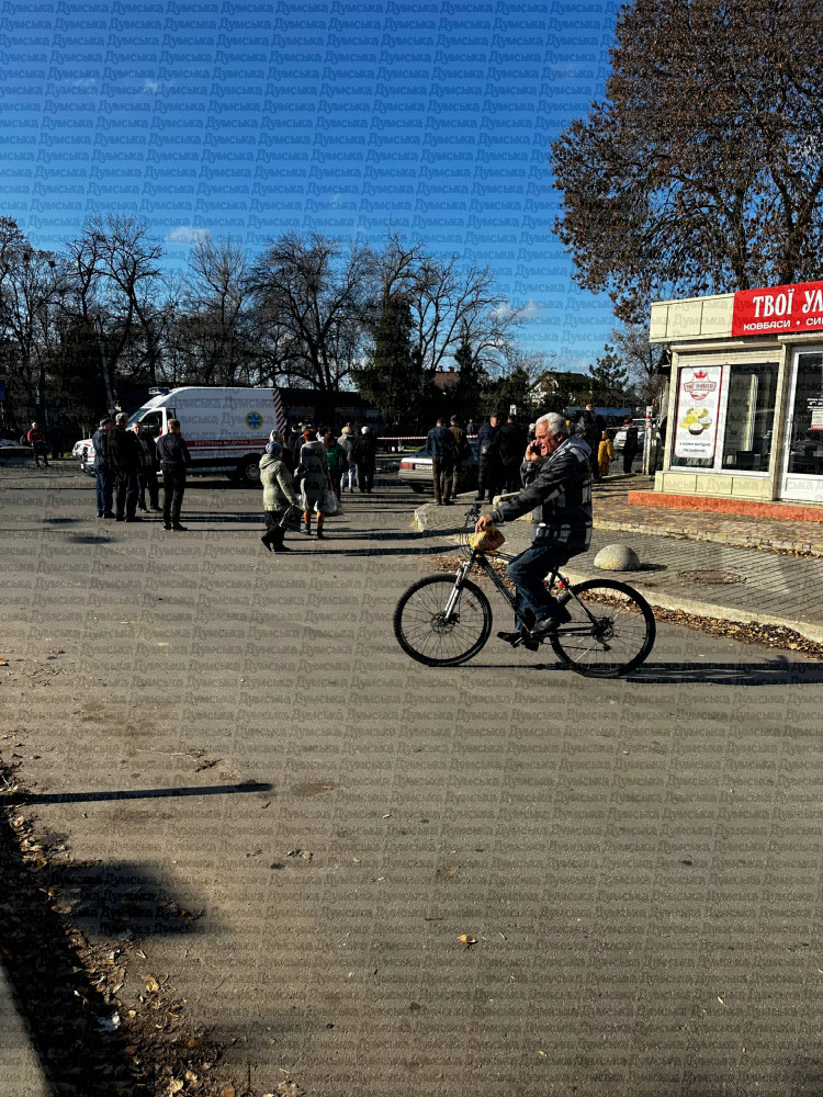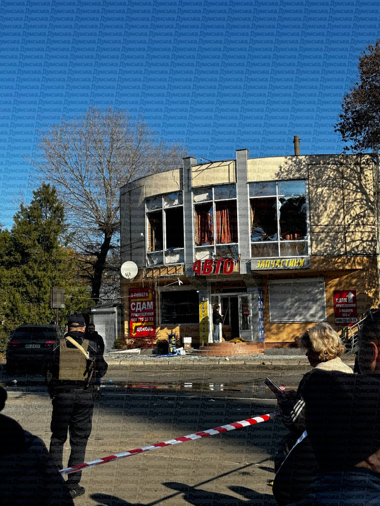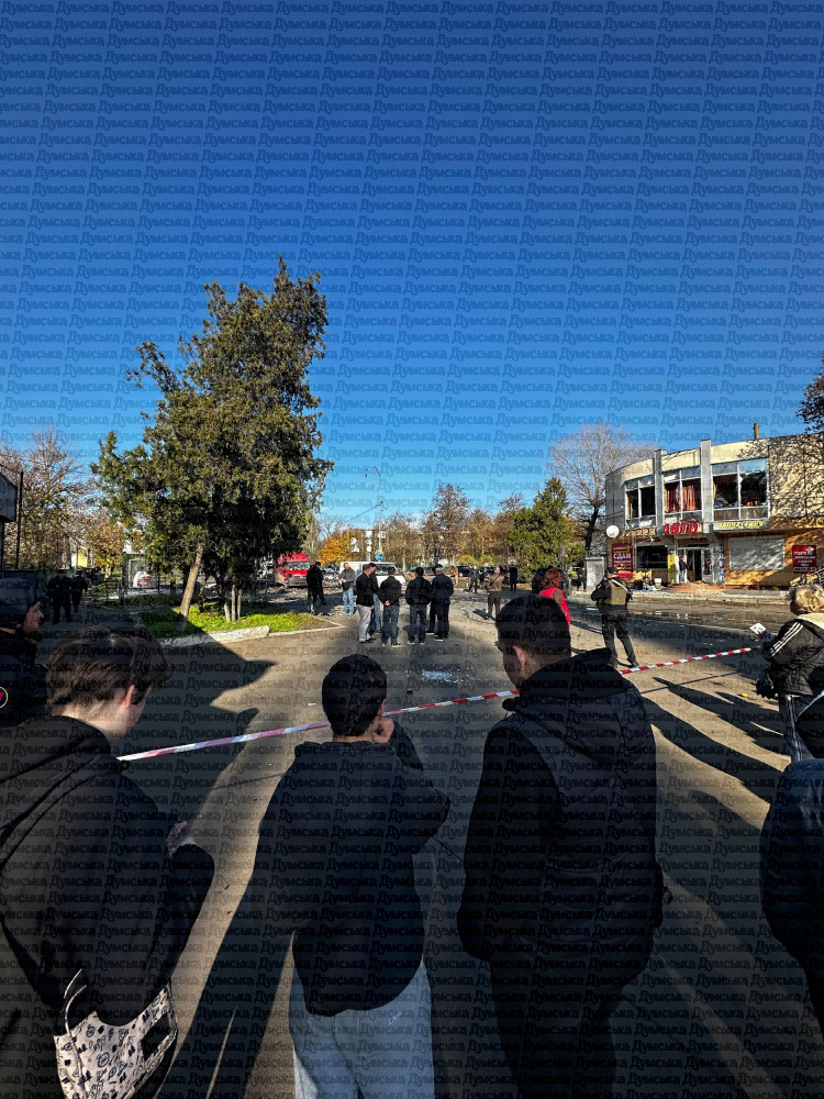 Взрывной волной повреждены несколько заведений, которые в зимний сезон были закрыты. По территории разбросаны обломки дрона, образовалась крупная воронка очевидцы подходят и осматривают место происшествия.
