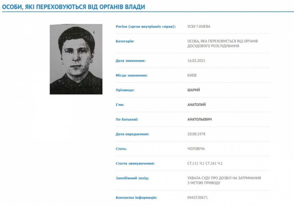 Согласно опубликованной информации, датой исчезновения Шария считается 16 февраля 2021 – именно в этот день ему объявили о подозрении в госизмене и ксенофобии (ч.1 ст.111 и ч.1 ст.161).