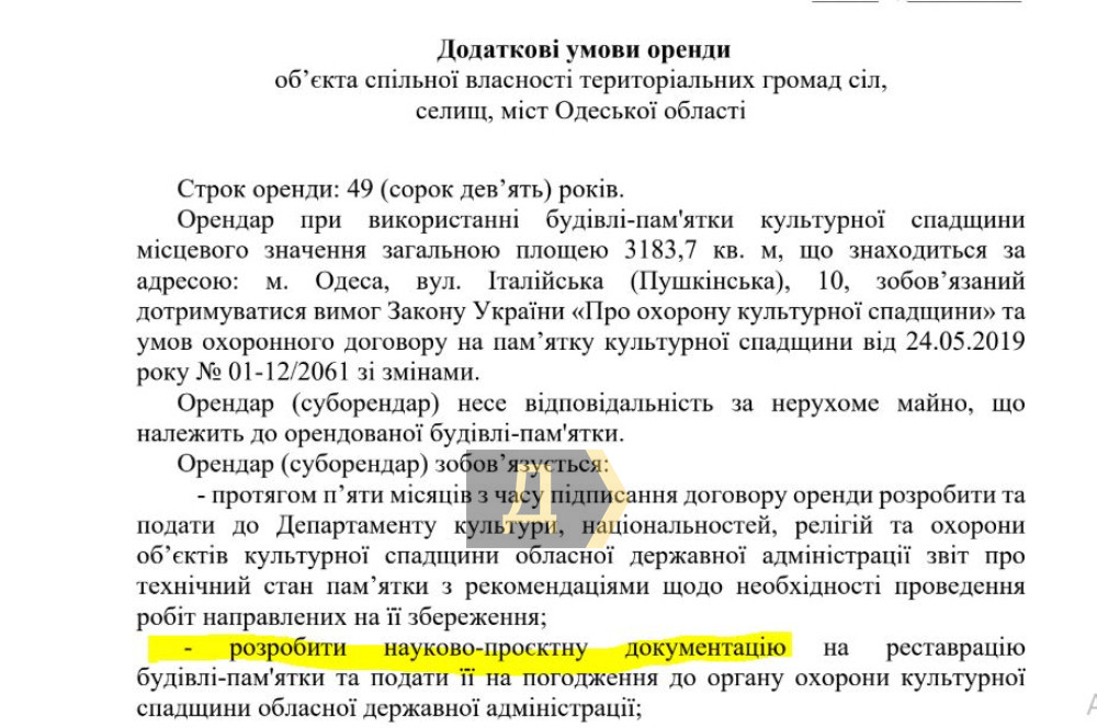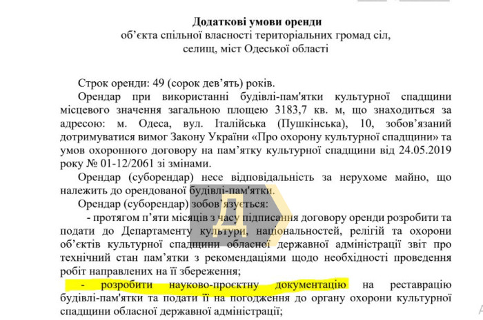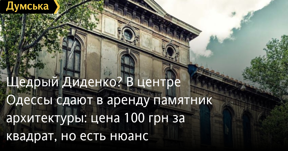 Щедрий Діденко? У центрі Одеси здають в оренду пам'ятку архітектури: ціна 100 грн за квадрат, але є нюансПам'ятку архітектури місцевого значення на Італійській, 10 знову здає в оренду Одеська облрада. Як передає кореспондент «Думської», орендаря будинку «Товариства взаємного кредиту» споруди початку XX століття виберуть на конкурсі 18 грудня — вже завтра. Стартова ціна за 3183,7 кв.м. — 308,6 тис. грн на місяць. Це близько 97 грн за метр історичної будівлі. Термін оренди — 49 років. Переможець аукціону буде зобов'язаний дотримуватися норм щодо захисту культурної спадщини та умов охоронного договору. Він несе повну відповідальність за стан пам'ятки, а також має протягом п'яти місяців підготувати звіт про її технічний стан. Також орендарю доведеться розробити й погодити проєкт реставрації пам'ятки архітектури. Нерухомість перебуває в управлінні Одеської обласної ради, яку очолює Григорій Діденко. Зазначимо, що для здачі будівлі в оренду не потрібен дозвіл депутатів на сесії. Фактично — особисте рішення глави зборів. Будову Одеського товариства взаємного кредиту звели в 1901-1903 роках за проєктом Олександра Бернардацці. У 1928 році її перебудували для потреб Держбанку СРСР. Об'єкт сильно постраждав у роки Другої світової, була відновлена 1948 року. У ній розміщувався міськком ЛКСМУ, а з 1982 року — Будинок політичної освіти обкому Компартії. З 1991 року будівлю орендував банк «Порто-Франко», який збанкрутував у 2014-му. СМЕРТЬ РОСІЙСЬКИМ ОКУПАНТАМ! Помітили помилку? Виділяйте слова з помилкою та натискайте control-enter |