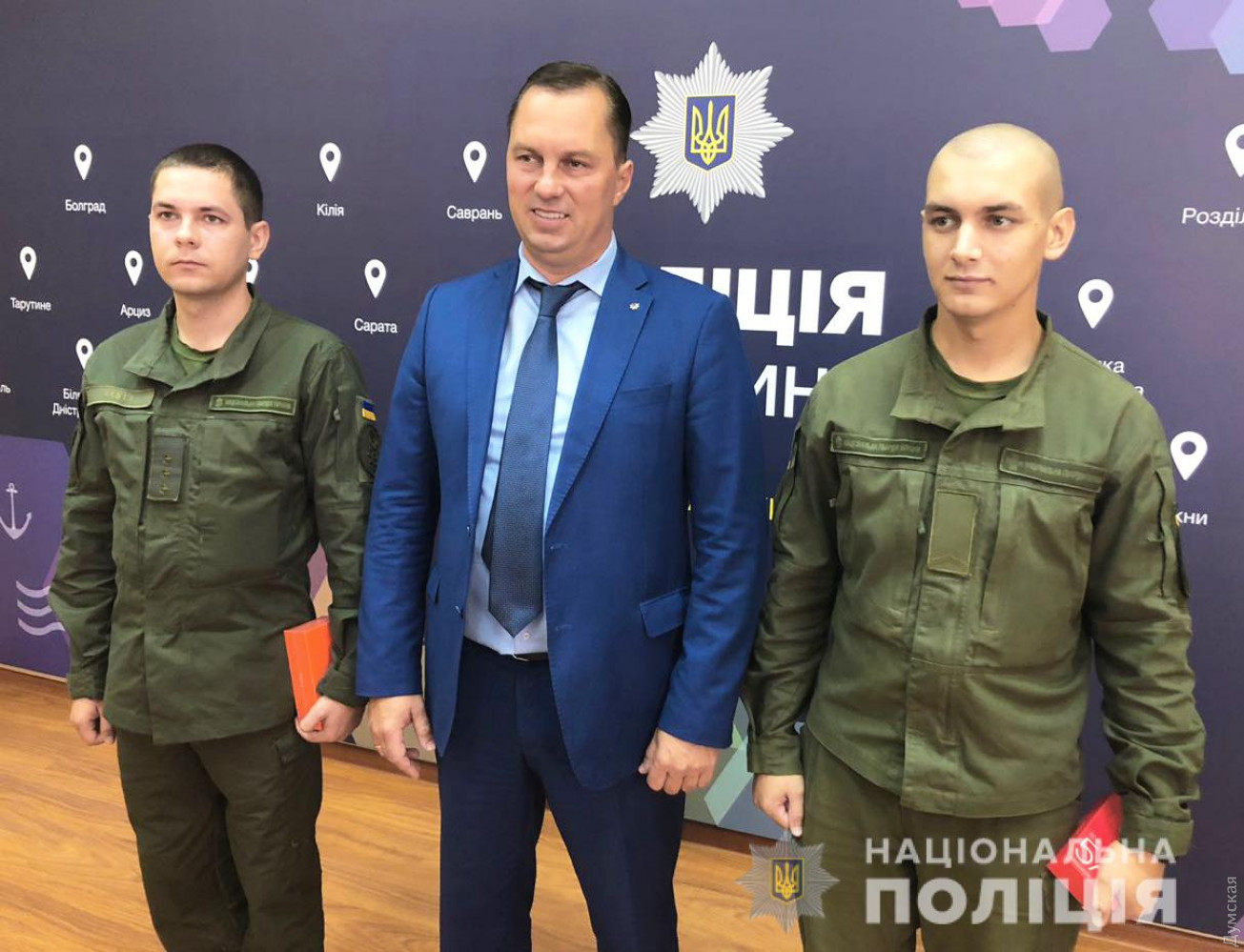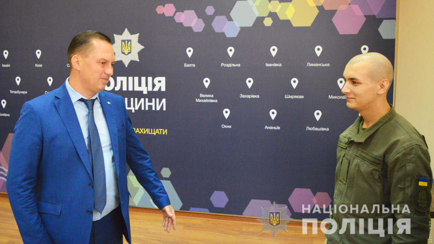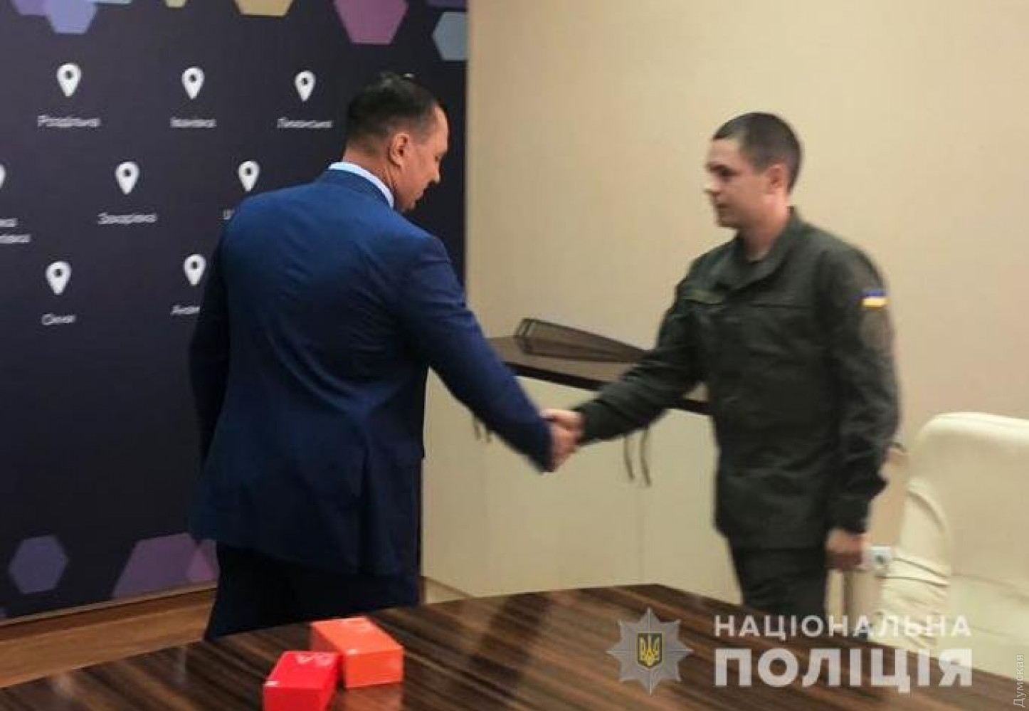 Глава главного управления Нацполиции в Одесской области Дмитрий Головин наградил ценными подарками старшего лейтенанта Дмитрия Охоту и старшего солдата Эдуарда Кожухаря, которые остановили массовую драку на Ланжероне.