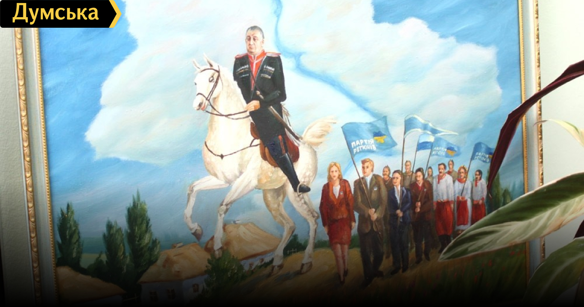 Картина: Тут все прекрасно! І джигіт Пресман, що чавить хати копитами, і чиновники райради, що ведуть за собою шароварних селян з хору Верьовки.