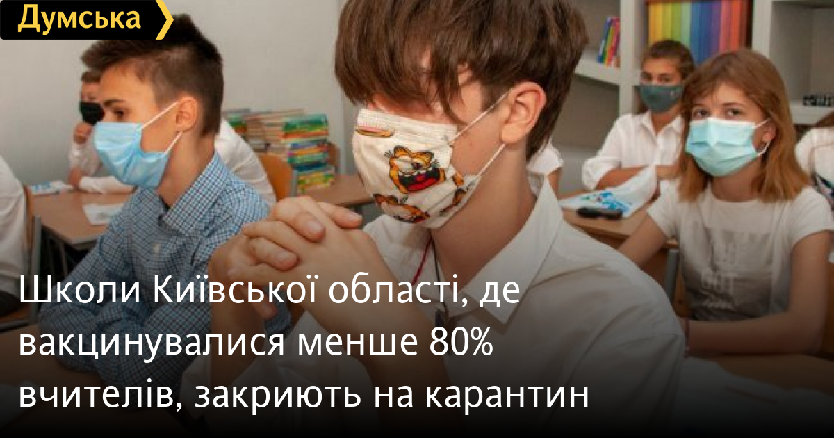 Школи Київської області, де вакцинувалися менше 80% вчителів, закриють на карантинШколи Київської області, в яких 80% вчителів не будуть вакциновані від COVID-19, закриють на карантин. Про це заявив голова Київської ОДА Василь Володін під час візиту до навчального закладу, повідомляє «Бабель». «Хочу достукатись до всіх освітян Київщини. Цього року наша область має можливість повноцінно функціонувати навіть у посилених карантинних нормах. Але є умова — працюватимуть тільки ті школи, де вакциновано 80% працівників, — заявив він. За словами Володіня, якщо до 20 вересня цього не буде зроблено, школу зачинять. Також він додав, що «онлайну більше не буде», і підкреслив, що захід — вимушений, тому що в області різко зростає кількість хворих і госпіталізацій. Такі саме заходи раніше анонсували в Івано-Франківській області. 20 вересня в Україні набуває чинності постанова уряду про нові карантинні заходи. В них мова йде про «зелений» та «жовтий» COVID-сертифікати та умови роботи закладів у різних зонах, поділених за рівнем епідемічної загрози. СМЕРТЬ РОССИЙСКИМ ОККУПАНТАМ! Заметили ошибку? Выделяйте слова с ошибкой и нажимайте control-enter |