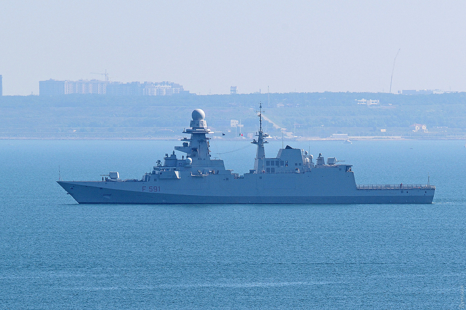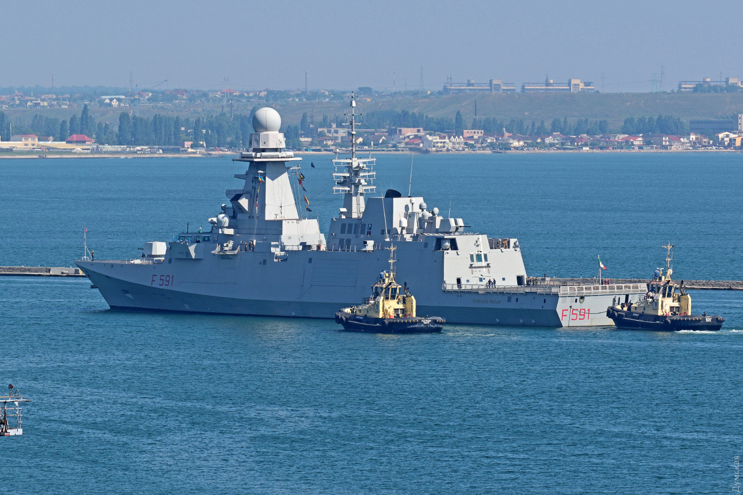 Первым зашел флагман соединения — итальянский фрегат «Вирджинио Фазан» F591. В 9:40 он встал к 18-ому причалу морвокзала.