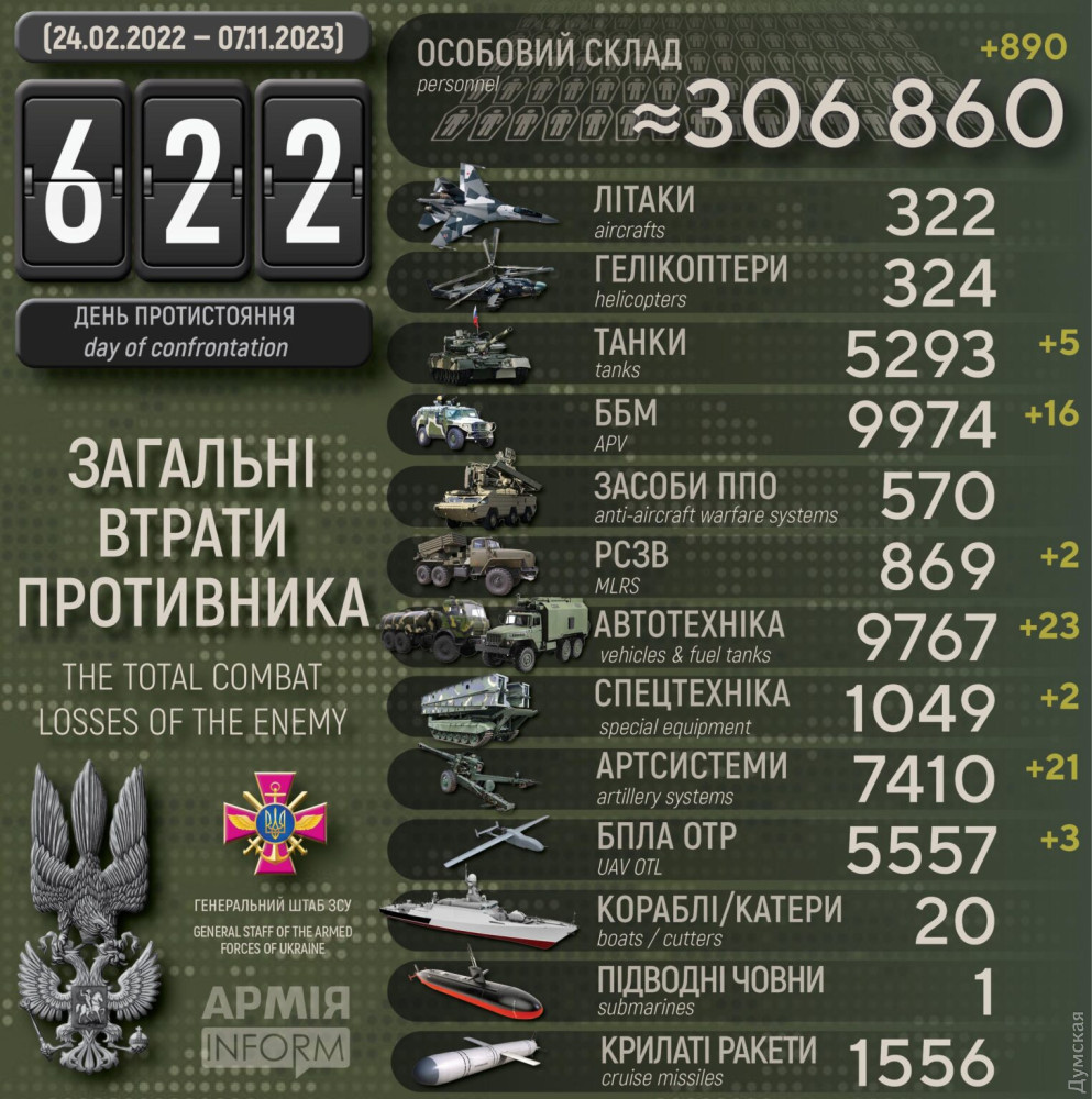 Сили оборони за добу знищили 21 артсистему, 16 бронемашин та майже 900 окупантівМайже 900 солдатів і офіцерів, 21 артилерійську систему та 16 бойових броньованих машин втратили російські загарбники минулої доби. За даними Генерального штабу Збройних сил України, наші захисники також знищили 5 танків, 2 РСЗВ, 3 дрони оперативно-тактичного рівня, 23 одиниці автомобільної техніки та 2 - спецтехніки. Загальні бойові втрати противника з 24.02.22 по 07.11.23 орієнтовно становлять: особового складу ‒ близько 306860 (+890) осіб, танків ‒ 5293 (+5) од, бойових броньованих машин ‒ 9974 (+16) од, артилерійських систем — 7410 (+21) од, РСЗВ — 869 (+2) од, засоби ППО ‒ 570 (+0) од, літаків — 322 (+0) од, гелікоптерів — 324 (+0) од, БПЛА оперативно-тактичного рівня — 5557 (+3), крилаті ракети ‒ 1556 (+0), кораблі /катери ‒ 20 (+0) од, підводні човни — 1 (+0) од, автомобільної техніки та автоцистерн — 9767 (+23) од, спеціальна техніка ‒ 1049 (+2). СМЕРТЬ РОСІЙСЬКИМ ОКУПАНТАМ! Помітили помилку? Виділяйте слова з помилкою та натискайте control-enter |