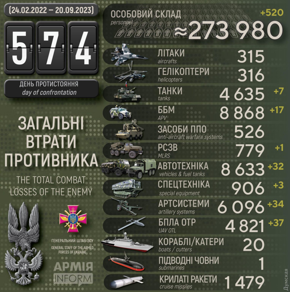 Сили оборони за добу знищили 34 ворожі артсистеми, 37 дронів та понад 500 окупантів520 окупантів, 34 ворожі артилерійські системи та 37 дронів оперативно-тактичного рівня втратили російські загарбники минулої доби. За даними Генерального штабу Збройних сил України, наші захисники знищили також 7 танків, 17 бойових броньованих машин, 35 артсистем, реактивну систему залпового вогню, 32 одиниці автомобільної техніки та 3 - спецтехніки. Крім того, до статистики нарешті додали субмарину, яку знищили ще 13 вересня. Ідеться про підводний човен «Ростов-на-Дону», що перебуває в сухому доці севастопольського судноремонтного заводу. Загальні бойові втрати противника з 24.02.22 по 20.09.23 орієнтовно становлять: особового складу ‒ 273980 (+520) осіб ліквідовано танків ‒ 4635 (+7) бойових броньованих машин ‒ 8868 (+17) артилерійських систем ‒ 6096 (+34) РСЗВ ‒ 779 (+1) засоби ППО ‒ 526 (0) літаків ‒ 315 (0) гелікоптерів ‒ 316 (0) БПЛА оперативно-тактичного рівня ‒ 4821 (+37) крилаті ракети ‒ 1479 (0) кораблі / катери ‒ 20 (0) підводні човни ‒ 1 (0) автомобільної техніки та автоцистерн ‒ 8633 (+32) спеціальна техніка ‒ 906 (+3) СМЕРТЬ РОСІЙСЬКИМ ОКУПАНТАМ! Помітили помилку? Виділяйте слова з помилкою та натискайте control-enter |