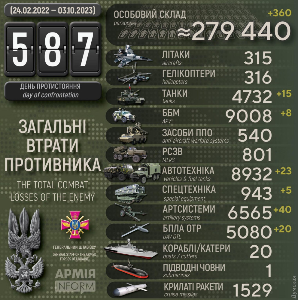 Сили оборони за добу знищили 40 ворожих артсистем та 20 дронів і 360 окупантів (інфографіка)Понад 360 окупантів, 40 артилерійських систем та 20 дронів оперативно-тактичного рівня втратили російські загарбники минулої доби. За даними Генерального штабу Збройних сил України, наші захисники знищили також 15 танків, 8 бойових броньованих машин, 23 одиниці автомобільної техніки та 5 — спецтехніки. Загальні бойові втрати противника з 24.02.22 по 03.10.23 орієнтовно становлять: особового складу ‒ 279440 (+360) осіб ліквідовано танків ‒ 4732 (+15) бойових броньованих машин ‒ 9008 (+8) артилерійських систем ‒ 6565 (+40) РСЗВ ‒ 801 (0) засоби ППО ‒ 540 (0) літаків ‒ 315 (0) гелікоптерів ‒ 316 (0) БПЛА оперативно-тактичного рівня ‒ 5080 (+20) крилаті ракети ‒ 1529 (0) кораблі / катери ‒ 20 (0) підводні човни ‒ 1 (0) автомобільної техніки та автоцистерн ‒ 8932 (+23) спеціальна техніка ‒ 943 (+5) СМЕРТЬ РОСІЙСЬКИМ ОКУПАНТАМ! Помітили помилку? Виділяйте слова з помилкою та натискайте control-enter |