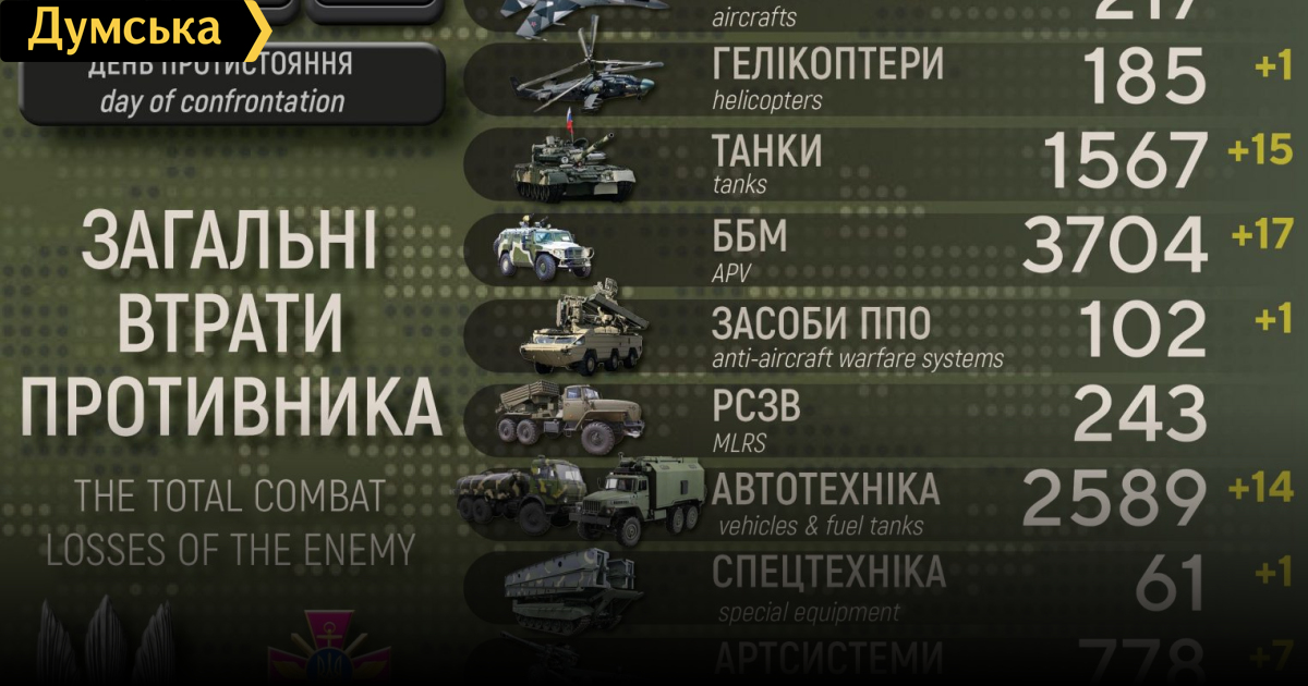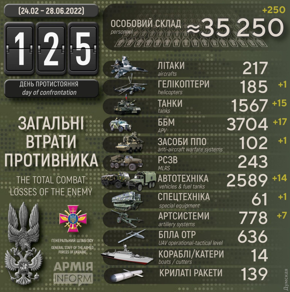 Сили оборони за добу знищили гелікоптер, 15 танків та сім артсистем окупантів (інфографіка)Гелікоптер, 15 танків та сім артилерійських систем втратили окупанти минулої доби в Україні. Вбито або потрапило у полон 250 російських нацистів, повідомляють у Генштабі Збройних сил України. Також українські захисники знищили 17 бойових броньованих машин, один засіб протиповітряної оборони, 14 одиниць автомобільної техніки та цистерн та одну спецтехніку. Загальні бойові втрати противника з 24.02 по 28.06 орієнтовно склали: особового складу ‒ близько 35 250 (+250) осіб ліквідовано, танків ‒ 1 567 (+15), бойових броньованих машин ‒ 3 704 (+17), артилерійських систем – 778 (+7), РСЗВ ‒ 243 (+0), засоби ППО ‒ 102 (+1), літаків – 217 (+0), гелікоптерів – 185 (+1), БПЛА оперативно-тактичного рівня ‒ 636 (+0), крилаті ракети ‒ 139 (+0), кораблі/ катери ‒ 14 (+0), автомобільної техніки та автоцистерн ‒ 2 589 (+14), спеціальна техніка ‒ 61 (+1). Найбільших втрат противник зазнав на бахмутському напрямку. Дані уточнюються. СМЕРТЬ РОСІЙСЬКИМ ОКУПАНТАМ! Помітили помилку? Виділяйте слова з помилкою та натискайте control-enter |