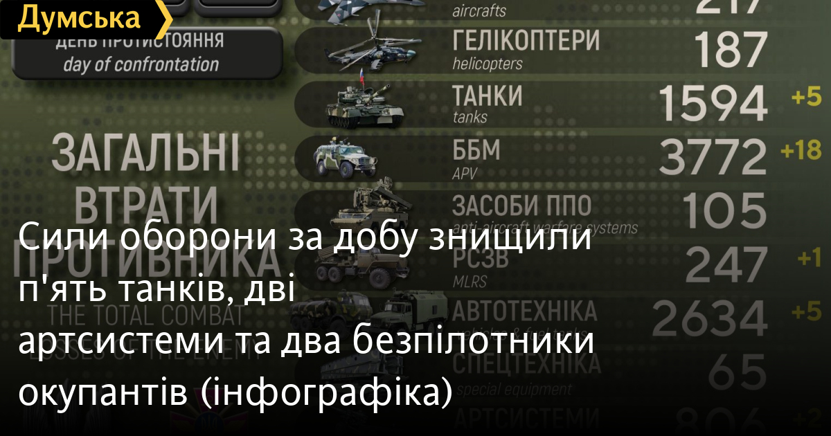 Сили оборони за добу знищили п'ять танків, дві артсистеми та два безпілотники окупантів (інфографіка)П'ять танків, дві артсистеми та два безпілотники оперативно-тактичного рівня втратили загарбники минулої доби в Україні. Вбито або потрапило у полон 150 російських нацистів, повідомляють у Генштабі Збройних сил України. Загальні бойові втрати противника з 24.02 по 05.07 орієнтовно склали: особового складу ‒ близько 36 350 (+150) осіб ліквідовано, танків ‒ 1 594(+5) од, бойових броньованих машин ‒ 3 7772 (+18) од, артилерійських систем – 806 (+2) од, РСЗВ ‒ 247 (+1) од, засоби ППО ‒ 105 (+0) од, літаків – 217 (+0) од, гелікоптерів – 187 (+0) од, БПЛА оперативно-тактичного рівня ‒ 660 (+2), крилаті ракети ‒ 144 (+0), кораблі /катери ‒ 15 (+0) од, автомобільної техніки та автоцистерн ‒ 2 634 (+5) од, спеціальна техніка ‒ 65 (+0). Найбільших втрат противник зазнав на слов’янському та донецькому напрямках. Дані уточнюються. СМЕРТЬ РОССИЙСКИМ ОККУПАНТАМ! Заметили ошибку? Выделяйте слова с ошибкой и нажимайте control-enter |