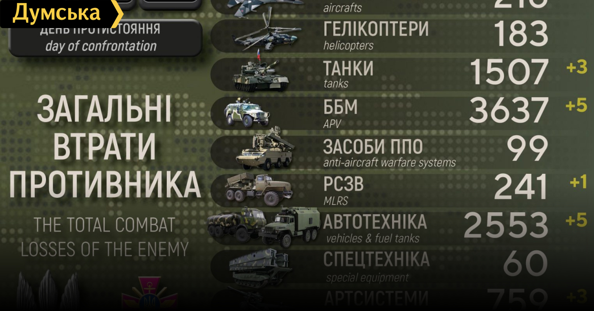 Сили оборони за добу знищили три російські танки, п'ять бойових броньованих машин та два безпілотникиТри танки, п'ять бойових броньованих машин та два безпілотники оперативно-тактичного рівня втратили окупанти минулої доби в Україні. Вбито або в полоні 100 російських нацистів. Крім того, як повідомляють у Генштабі Збройних сил, українські захисники знищили одну реактивну систему залпового вогню, три артсистеми та п'ять одиниць автомобільної техніки та цистерн. Загальні бойові втрати противника з 24.02 по 24.06 орієнтовно склали: особового складу — близько 34530 (+100) осіб ліквідовано, танків ‒ 1507 (+3), бойових броньованих машин ‒ 3637 (+5), артилерійських систем – 759 (+3), РСЗВ — 241 (+1), засоби ППО - 99 (+0), літаків – 216 (+0), гелікоптерів – 183 (+0), БПЛА оперативно-тактичного рівня — 622 (+2), крилаті ракети — 137 (+0), кораблі /катери — 14 (+0), автомобільної техніки та автоцистерн — 2553 (+5), спеціальна техніка — 60 (+0). Найбільших втрат противник зазнав на слов'янському та бахмутському напрямках. Дані уточнюються. СМЕРТЬ РОСІЙСЬКИМ ОКУПАНТАМ! Помітили помилку? Виділяйте слова з помилкою та натискайте control-enter |