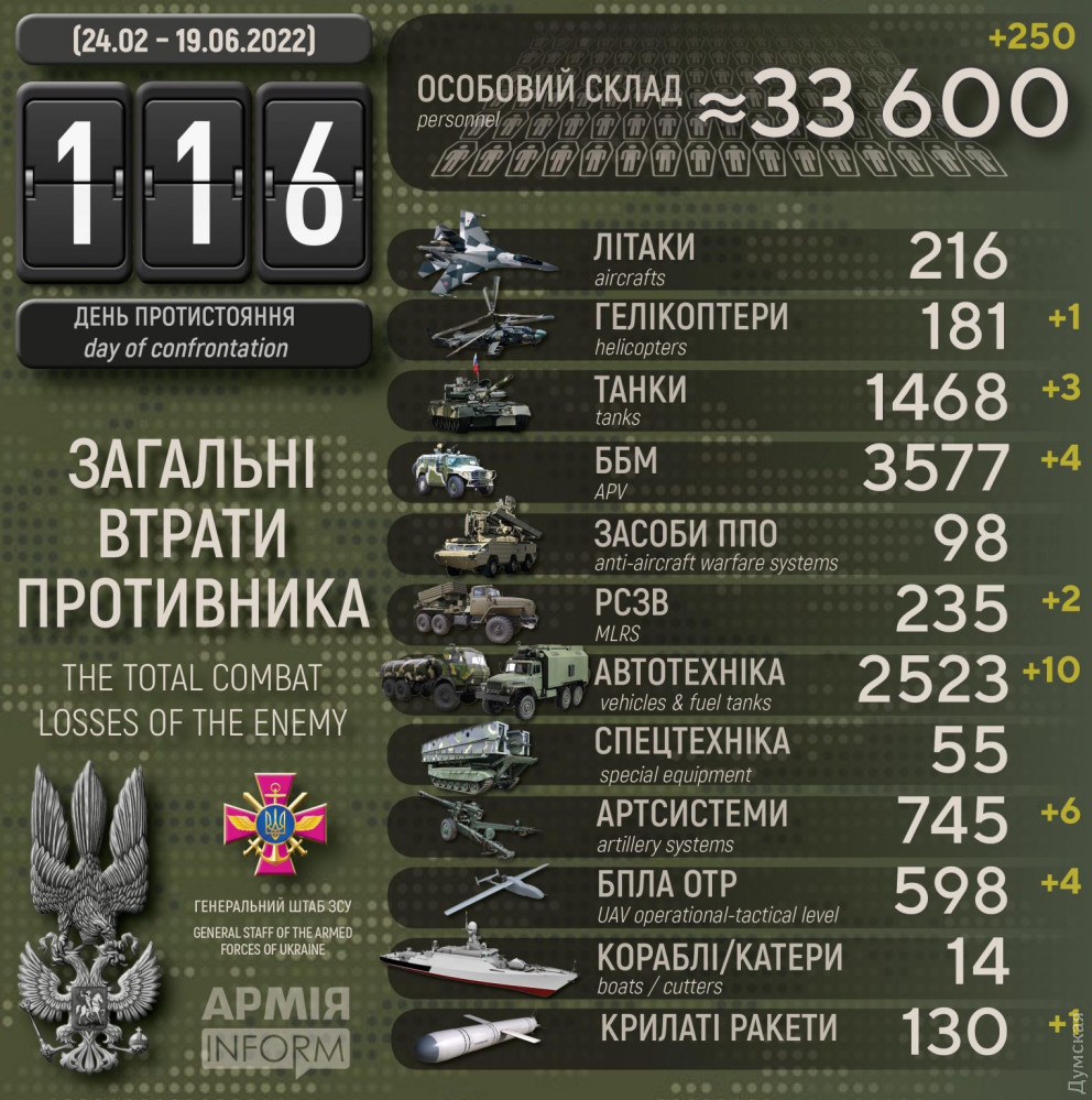 Загальні бойові втрати противника з 24.02 по 19.06 орієнтовно склали: