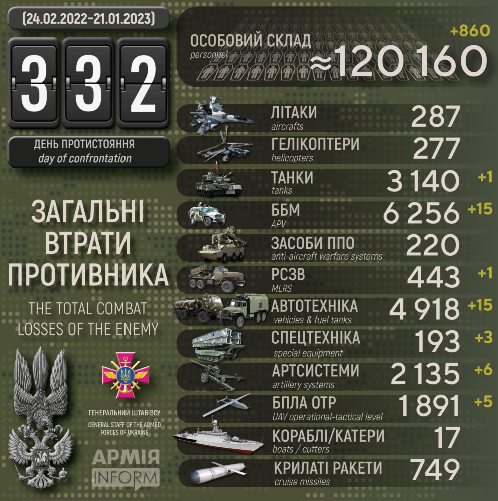 Сили оборони знищили 860 окупантів, 15 бронемашин та шість артсистем росіян за добу (інфографіка)860 окупантів і 5 бронемашин та шість артилерійських систем російських нацистів знищили за минулу добу Сили оборони України. В Генштабі Збройних сил повідомили, що противник втратив також танк, реактивну систему залпового вогню, п'ять дронів оперативно-тактичного рівня, 15 одиниць автомобільної техніки та автоцистерн та три — спецтехніки. Всього з початку повномасштабної війни українські захисники знищили приблизно: особового складу ‒ близько 120 160 (+860) осіб ліквідовано; танків ‒ 3140 (+1) од.; бойових броньованих машин ‒ 6256 (+15) од.; артилерійських систем — 2135 (+6) од.; РСЗВ — 443 (+1) од.; засоби ППО ‒ 220 од.; літаків — 287 од.; гелікоптерів — 277 од.; БПЛА оперативно-тактичного рівня — 1891 (+5) од.; крилаті ракети ‒ 749 од.; кораблі / катери ‒ 17 од.; автомобільної техніки та автоцистерн — 4918 (+15) од.; спеціальна техніка ‒ 193 (+3) од. СМЕРТЬ РОСІЙСЬКИМ ОКУПАНТАМ! Помітили помилку? Виділяйте слова з помилкою та натискайте control-enter |