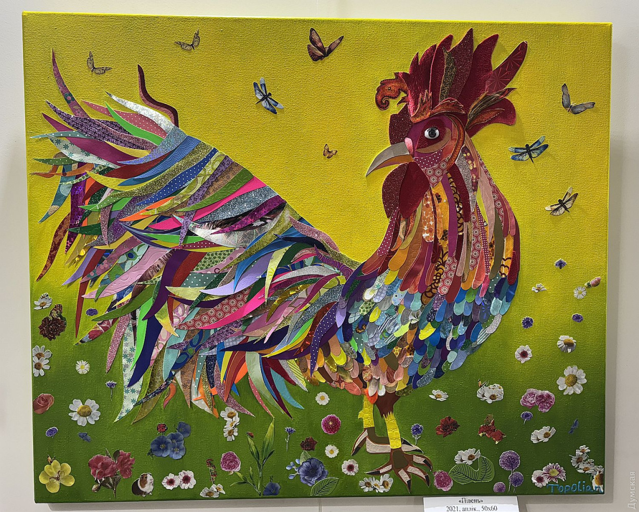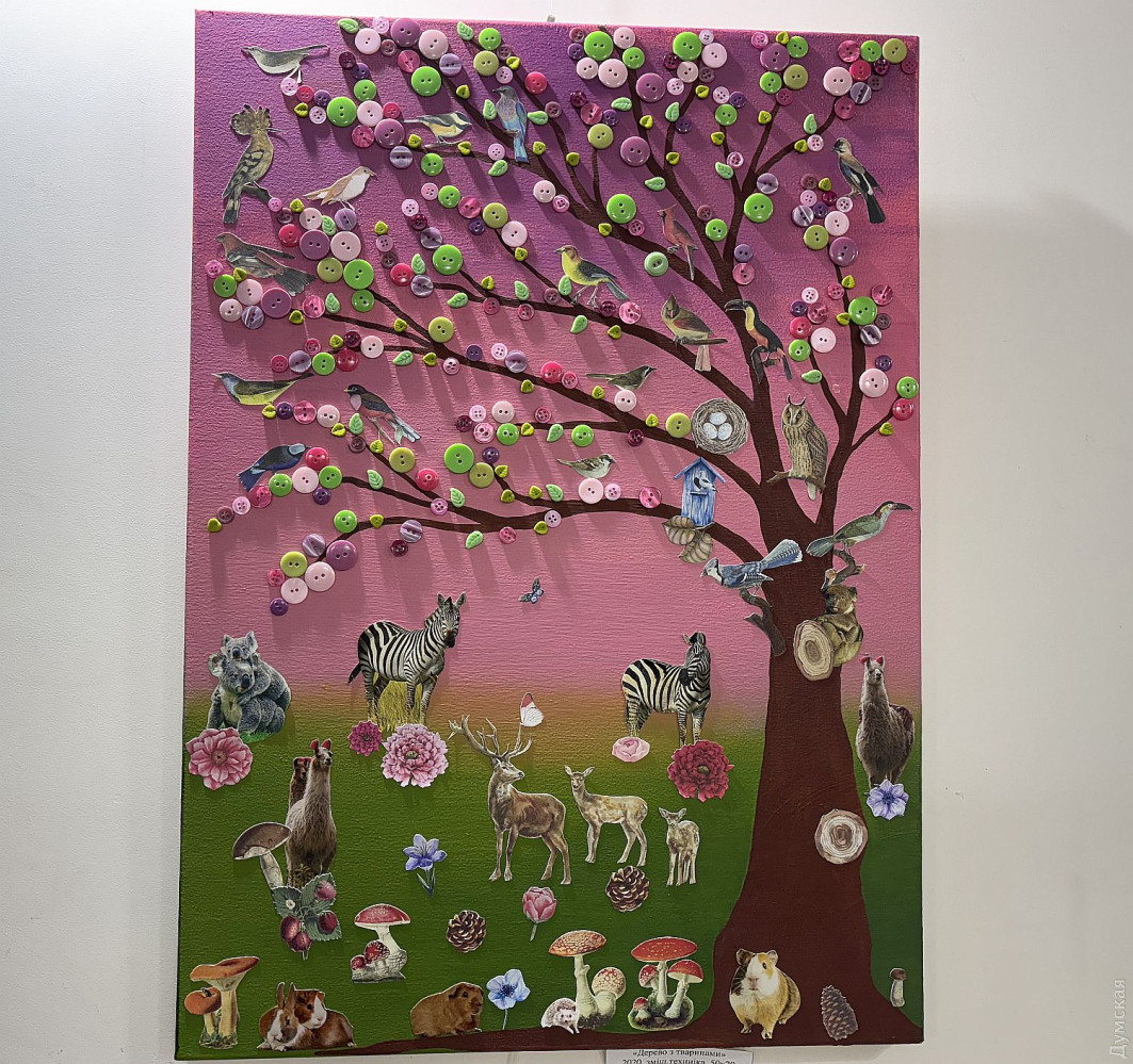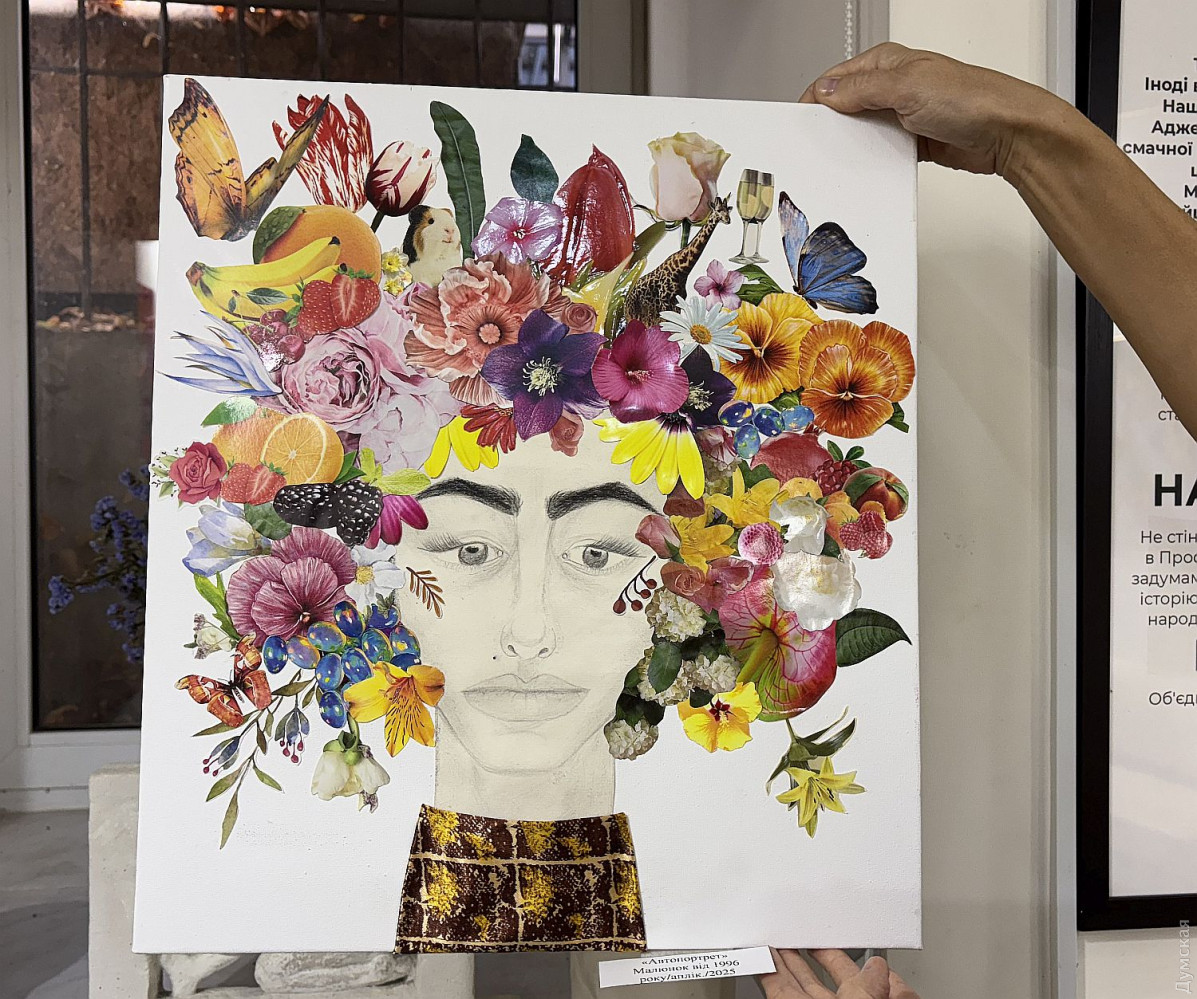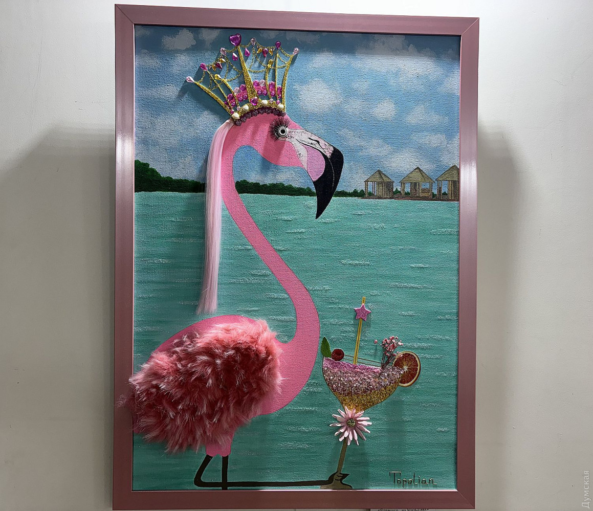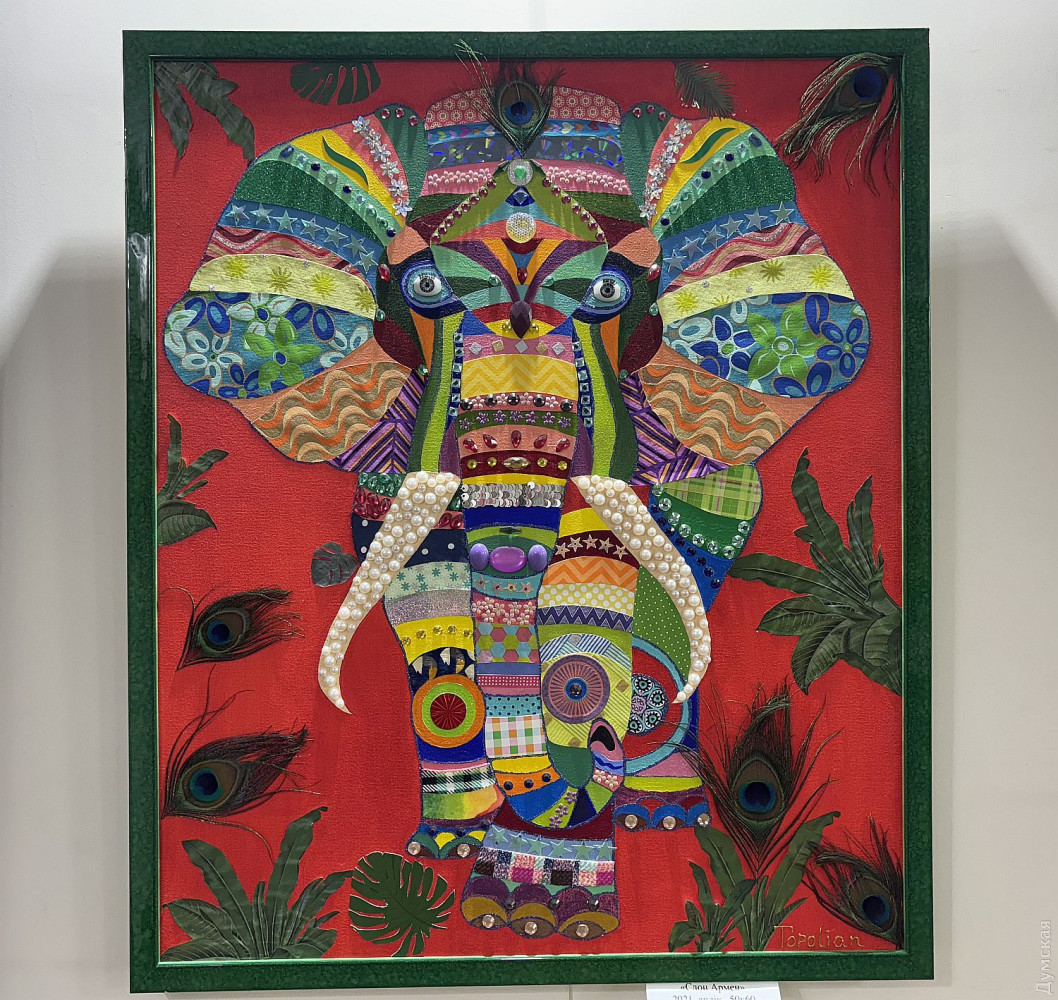 Виставка живопису та колажів Олександри Тополян «Внутрішнє сонце» працює у творчому просторі «Діалоги» (Соборна площа, 2). Перегляд цієї експозиції справляє такий самий ефект, як і поживний обід, бо око українського глядача генетично «заточений» на соковиті тони та екзотичні сюжети. Переходячи від «Головоломки ацтеків» до «Святкового настрою», не здогадуєшся, що перед тобою картини художника-аматора. Але це так. «Я 17 років працюю нотаріусом, у 2000 році переїхала до Одеси з Білгорода-Дністровського, де народилася, де й тепер живуть мої мама та сестра, люблю дуже це місто, Бессарабію в цілому. І Одесу, звісно, люблю, тут закінчила юридичну академію. А картини почала писати під час карантину. Спочатку малювала олівцями, фломастерами, а за пару місяців чоловік мені сказав: «Що ти даремно гаєш час, спробуй на полотні олією, раптом вийде». Брала маленькі полотна, потім процес мене вельми захопив, і ось сьогодні ви можете бачити моїх «діток», як я їх називаю, які з’явилися за п’ять років», — представляє свою експозицію автор. У дитинстві Саша не відвідувала художню школу, зате закінчила музичну семирічку по фортепіано. Хоча у 1996 році якось накидала олівцем жіночий портрет, а за чверть століття зробила колаж на основі цього малюнку. Тато-архітектор малював красиві кораблі, потім змінив професію, от і виходить, що наша героїня стала першою мисткинею в родині. Олександра тяжіє до декоративно-ужиткового мистецтва і нерідко включає у свої твори стрази, лелітки, намистини, пір’я… Коли була маленькою, любила перебирати ґудзики, що зберігалися у мами в окремій валізці, розкладала їх за кольором. На олійні фарби полюбляє наносити глітер, нехай сяє. Вважає таку любов до декору впливом культури народів Бессарабії. Проте є в неї й вроджене почуття міри, смак не підводить. До «Діалогів» зайшла з цікавості, коли прямувала на роботу, та познайомилася з хазяйкою галереї. Побачивши роботи Олександри, одразу запропонувала відкрити виставку. «Не люблю стан депресії, — зізнається Саша. — В нашому будинку з видом на море чоловік влаштував мені студію, де я творю, занурюючись у свій світ. Виникає ідея, одразу ж починаю її реалізувати. Щоправда, глядач може надати свого значення побаченому. Наприклад, трійцю різнокольорових жабок мій чоловік називає «Кохання втрьох». А я такого сенсу не вкладала, взагалі жабок полюбляю, у мене в офісі ціла колекція фігурок, і по всьому будинку вони теж стоять. Це працює». За системою феншуй жабки привертають матеріальне процвітання, проте є й важливе правило: феншуй допомагає тим, хто діє! І творча дисципліна для Саші теж важлива, навіть якщо день не вдався, обов’язково зробить хоча б пару порухів пензлем. «До війни моїми клієнтами були в основному іноземці: переклад, легалізація, апостиль, — каже Олександра Тополян. Зараз важкі часи, до мене звертаються військові інваліди, пенсіонери, переселенці, у них багацько проблем, що їх треба вирішувати. Кожного я маю вислухати, кожному допомогти. А у студії я відпочиваю, розслабляюся, насичуюся енергією, по п’ять-шість годин поспіль можу малювати, вирізати, наклеювати. Після цього почуваюся сонечком і знову здатна дарувати радість людям». Чорну фарбу мисткиня майже не використовує, чорним у неї може бути лише тло. «На початку війни я опинилася з дітьми в Албанії, прожила там майже рік, і в