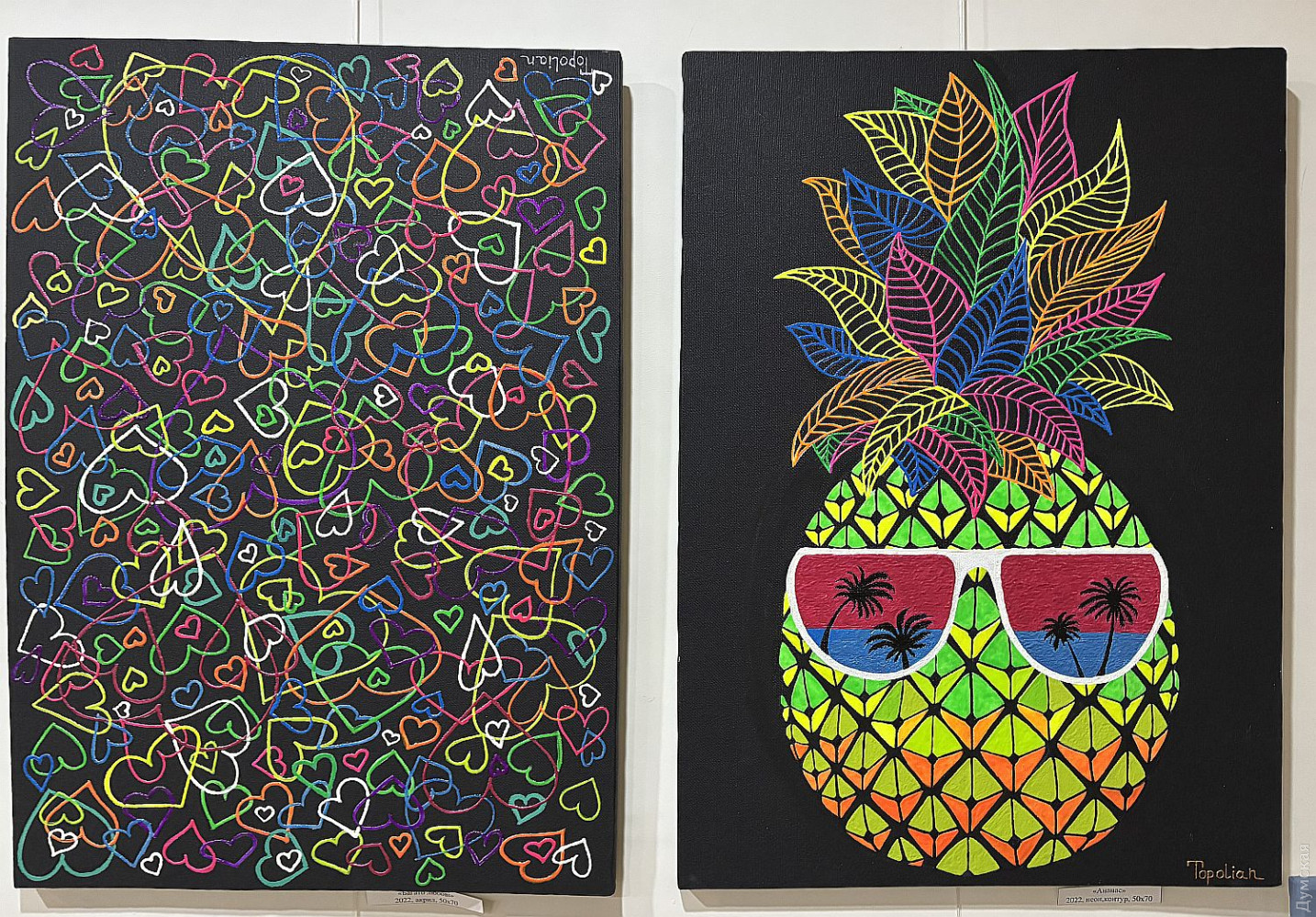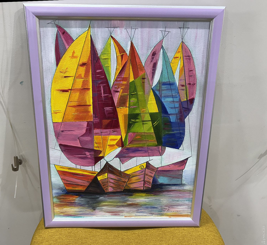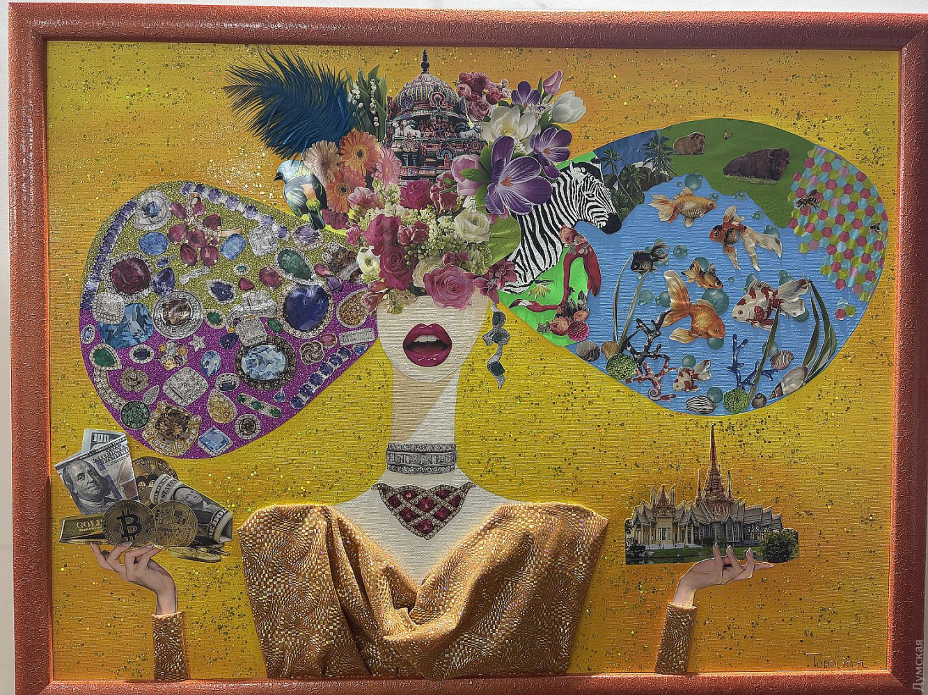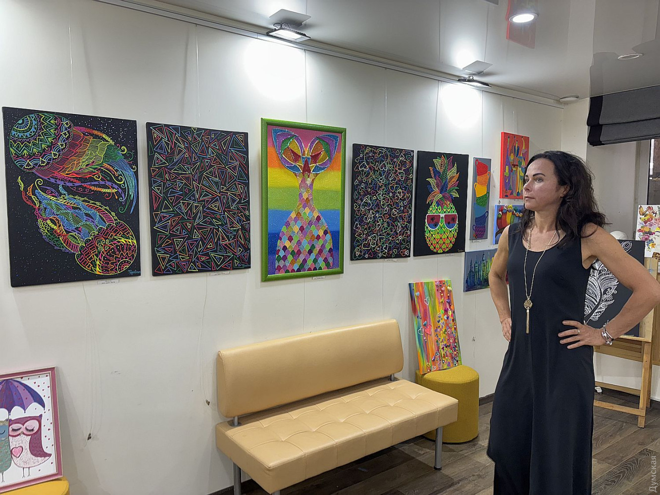 Виставка живопису та колажів Олександри Тополян «Внутрішнє сонце» працює у творчому просторі «Діалоги» (Соборна площа, 2). Перегляд цієї експозиції справляє такий самий ефект, як і поживний обід, бо око українського глядача генетично «заточений» на соковиті тони та екзотичні сюжети. Переходячи від «Головоломки ацтеків» до «Святкового настрою», не здогадуєшся, що перед тобою картини художника-аматора. Але це так. «Я 17 років працюю нотаріусом, у 2000 році переїхала до Одеси з Білгорода-Дністровського, де народилася, де й тепер живуть мої мама та сестра, люблю дуже це місто, Бессарабію в цілому. І Одесу, звісно, люблю, тут закінчила юридичну академію. А картини почала писати під час карантину. Спочатку малювала олівцями, фломастерами, а за пару місяців чоловік мені сказав: «Що ти даремно гаєш час, спробуй на полотні олією, раптом вийде». Брала маленькі полотна, потім процес мене вельми захопив, і ось сьогодні ви можете бачити моїх «діток», як я їх називаю, які з’явилися за п’ять років», — представляє свою експозицію автор. У дитинстві Саша не відвідувала художню школу, зате закінчила музичну семирічку по фортепіано. Хоча у 1996 році якось накидала олівцем жіночий портрет, а за чверть століття зробила колаж на основі цього малюнку. Тато-архітектор малював красиві кораблі, потім змінив професію, от і виходить, що наша героїня стала першою мисткинею в родині. Олександра тяжіє до декоративно-ужиткового мистецтва і нерідко включає у свої твори стрази, лелітки, намистини, пір’я… Коли була маленькою, любила перебирати ґудзики, що зберігалися у мами в окремій валізці, розкладала їх за кольором. На олійні фарби полюбляє наносити глітер, нехай сяє. Вважає таку любов до декору впливом культури народів Бессарабії. Проте є в неї й вроджене почуття міри, смак не підводить. До «Діалогів» зайшла з цікавості, коли прямувала на роботу, та познайомилася з хазяйкою галереї. Побачивши роботи Олександри, одразу запропонувала відкрити виставку. «Не люблю стан депресії, — зізнається Саша. — В нашому будинку з видом на море чоловік влаштував мені студію, де я творю, занурюючись у свій світ. Виникає ідея, одразу ж починаю її реалізувати. Щоправда, глядач може надати свого значення побаченому. Наприклад, трійцю різнокольорових жабок мій чоловік називає «Кохання втрьох». А я такого сенсу не вкладала, взагалі жабок полюбляю, у мене в офісі ціла колекція фігурок, і по всьому будинку вони теж стоять. Це працює». За системою феншуй жабки привертають матеріальне процвітання, проте є й важливе правило: феншуй допомагає тим, хто діє! І творча дисципліна для Саші теж важлива, навіть якщо день не вдався, обов’язково зробить хоча б пару порухів пензлем. «До війни моїми клієнтами були в основному іноземці: переклад, легалізація, апостиль, — каже Олександра Тополян. Зараз важкі часи, до мене звертаються військові інваліди, пенсіонери, переселенці, у них багацько проблем, що їх треба вирішувати. Кожного я маю вислухати, кожному допомогти. А у студії я відпочиваю, розслабляюся, насичуюся енергією, по п’ять-шість годин поспіль можу малювати, вирізати, наклеювати. Після цього почуваюся сонечком і знову здатна дарувати радість людям». Чорну фарбу мисткиня майже не використовує, чорним у неї може бути лише тло. «На початку війни я опинилася з дітьми в Албанії, прожила там майже рік, і в
