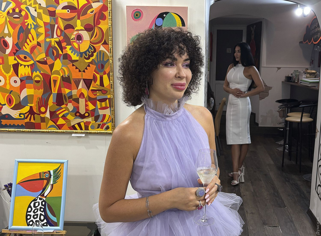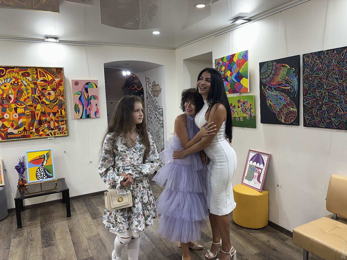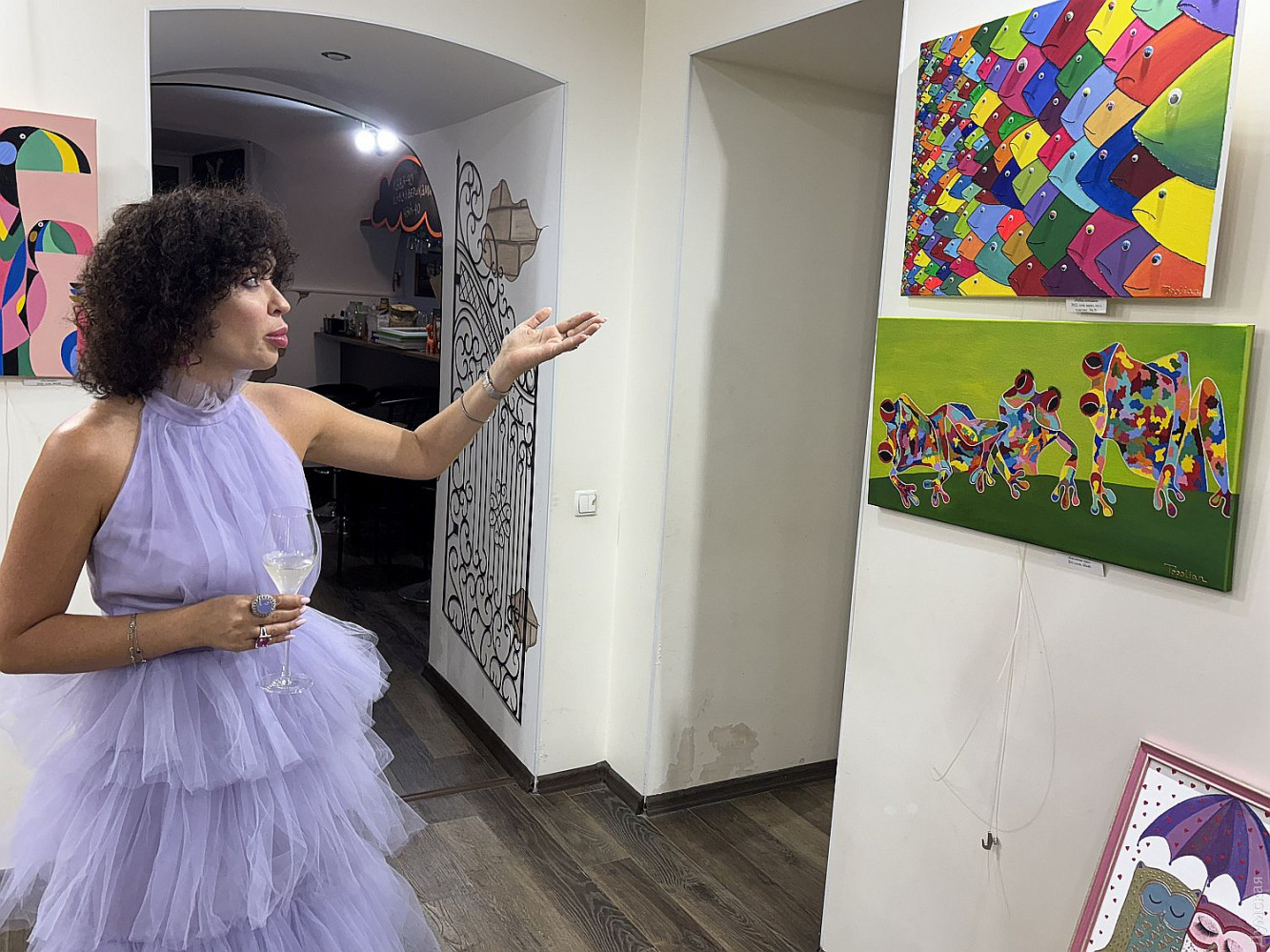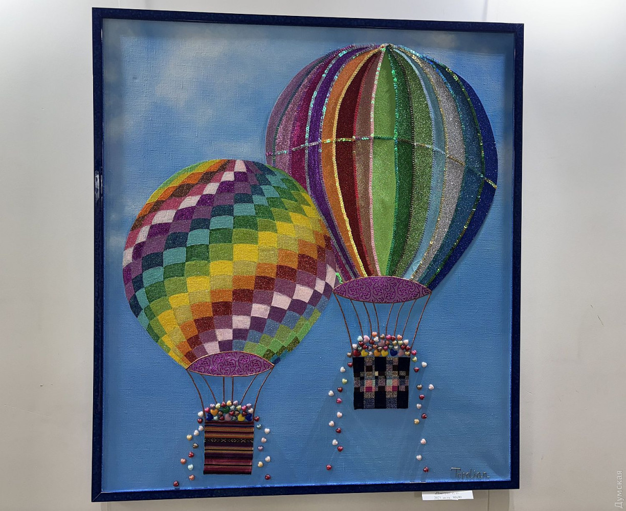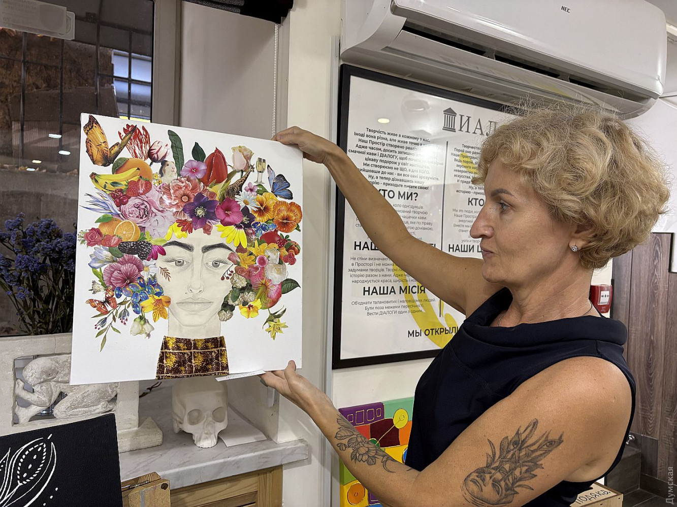 Виставка живопису та колажів Олександри Тополян «Внутрішнє сонце» працює у творчому просторі «Діалоги» (Соборна площа, 2). Перегляд цієї експозиції справляє такий самий ефект, як і поживний обід, бо око українського глядача генетично «заточений» на соковиті тони та екзотичні сюжети. Переходячи від «Головоломки ацтеків» до «Святкового настрою», не здогадуєшся, що перед тобою картини художника-аматора. Але це так. «Я 17 років працюю нотаріусом, у 2000 році переїхала до Одеси з Білгорода-Дністровського, де народилася, де й тепер живуть мої мама та сестра, люблю дуже це місто, Бессарабію в цілому. І Одесу, звісно, люблю, тут закінчила юридичну академію. А картини почала писати під час карантину. Спочатку малювала олівцями, фломастерами, а за пару місяців чоловік мені сказав: «Що ти даремно гаєш час, спробуй на полотні олією, раптом вийде». Брала маленькі полотна, потім процес мене вельми захопив, і ось сьогодні ви можете бачити моїх «діток», як я їх називаю, які з’явилися за п’ять років», — представляє свою експозицію автор. У дитинстві Саша не відвідувала художню школу, зате закінчила музичну семирічку по фортепіано. Хоча у 1996 році якось накидала олівцем жіночий портрет, а за чверть століття зробила колаж на основі цього малюнку. Тато-архітектор малював красиві кораблі, потім змінив професію, от і виходить, що наша героїня стала першою мисткинею в родині. Олександра тяжіє до декоративно-ужиткового мистецтва і нерідко включає у свої твори стрази, лелітки, намистини, пір’я… Коли була маленькою, любила перебирати ґудзики, що зберігалися у мами в окремій валізці, розкладала їх за кольором. На олійні фарби полюбляє наносити глітер, нехай сяє. Вважає таку любов до декору впливом культури народів Бессарабії. Проте є в неї й вроджене почуття міри, смак не підводить. До «Діалогів» зайшла з цікавості, коли прямувала на роботу, та познайомилася з хазяйкою галереї. Побачивши роботи Олександри, одразу запропонувала відкрити виставку. «Не люблю стан депресії, — зізнається Саша. — В нашому будинку з видом на море чоловік влаштував мені студію, де я творю, занурюючись у свій світ. Виникає ідея, одразу ж починаю її реалізувати. Щоправда, глядач може надати свого значення побаченому. Наприклад, трійцю різнокольорових жабок мій чоловік називає «Кохання втрьох». А я такого сенсу не вкладала, взагалі жабок полюбляю, у мене в офісі ціла колекція фігурок, і по всьому будинку вони теж стоять. Це працює». За системою феншуй жабки привертають матеріальне процвітання, проте є й важливе правило: феншуй допомагає тим, хто діє! І творча дисципліна для Саші теж важлива, навіть якщо день не вдався, обов’язково зробить хоча б пару порухів пензлем. «До війни моїми клієнтами були в основному іноземці: переклад, легалізація, апостиль, — каже Олександра Тополян. Зараз важкі часи, до мене звертаються військові інваліди, пенсіонери, переселенці, у них багацько проблем, що їх треба вирішувати. Кожного я маю вислухати, кожному допомогти. А у студії я відпочиваю, розслабляюся, насичуюся енергією, по п’ять-шість годин поспіль можу малювати, вирізати, наклеювати. Після цього почуваюся сонечком і знову здатна дарувати радість людям». Чорну фарбу мисткиня майже не використовує, чорним у неї може бути лише тло. «На початку війни я опинилася з дітьми в Албанії, прожила там майже рік, і в