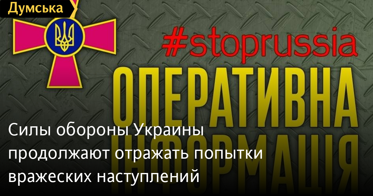 Сили оборони України продовжують відбивати спроби ворожих наступівОкупанти ще сподіваються проломити оборону українських військ на різних ділянках фронту. Спроби їх наступів успішно відбивають Сили оборони України. За даними Генерального штабу Збройних сил України, у Харківській області окупанти намагаються просунутися в районі Леб'яжого та Базаліївки. Бої у цьому районі продовжуються. У районі Слов'янська противник намагався наступати у районі Богородичного, успіху не мав і відійшов. У Мазанівки та Новодмитрівки бої продовжуються. На краматорському напрямі рашисти вели наступ у районі Спірного. Нічого не вийшло, вони зазнали втрат і відійшли. На бахмутському напрямку вороги штурмували Залізне, Шуми та Зайцеве. Безуспішно. У районі Соледара та Бахмутського продовжуються бої. На околицях Донецька окупанти штурмують Опитне. Бій продовжується. У Запорізькій області противник наступав у районі Шевченкового, отримав відсіч і відійшов. Тривають бої у районі Новомихайлівки. На південнобузькому напрямку рашисти зайняті зміцненням раніше захоплених рубежів. Уздовж лінії фронту продовжуються інтенсивні артилерійські обстріли. СМЕРТЬ РОСІЙСЬКИМ ОКУПАНТАМ! Помітили помилку? Виділяйте слова з помилкою та натискайте control-enter |