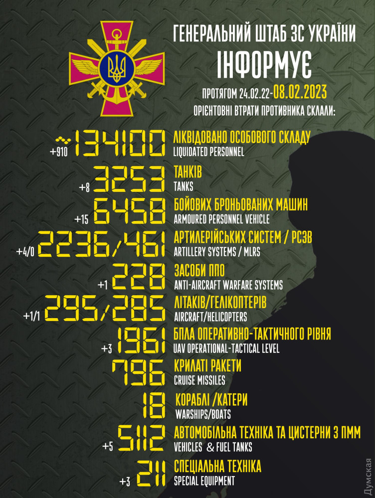 Сили оборони України за добу знищили 910 окупантів, літак і вертоліт910 російських солдатів і офіцерів було знищено в Україні 7 лютого. За час повномасштабного вторгнення втрати противника становлять 134 тисячі 100 військовослужбовців. За даними Генерального штабу Збройних сил України, також учора наші війська спалили вісім ворожих танків (3253 за весь час), 15 броньованих бойових машин (6458), п'ять вантажівок (5112), три одиниці спецтехніки (211), чотири артилерійські системи (2236) і одну установку ППО (228). Було збито один літак (295) і один вертоліт (285), а також три безпілотники оперативно-тактичного рівня (1961). СМЕРТЬ РОСІЙСЬКИМ ОКУПАНТАМ! Помітили помилку? Виділяйте слова з помилкою та натискайте control-enter |