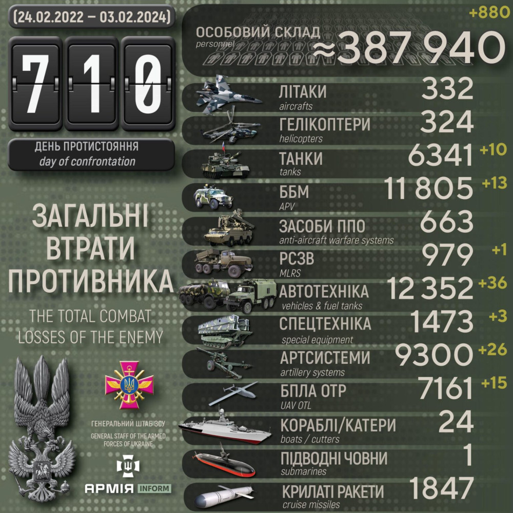 Сили оборони за добу знищили 10 ворожих танків, 26 артсистем та майже 900 окупантівМайже 900 солдатів і офіцерів, 10 танків та 26 артилерійських систем втратили російські загарбники минулої доби. За даними Генерального штабу Збройних сил України, наші захисники також знищили 13 бойових броньованих машин, РСЗВ, 15 дронів оперативно-тактичного рівня, 36 одиниць автомобільної техніки та 3 - спецтехніки. Загальні бойові втрати противника з 24.02.22 по 03.02.24 орієнтовно становлять: особового складу — 387 940 (+880) осіб ліквідовано танків — 6341 (+10) бойових броньованих машин — 11805 (+13) артилерійських систем — 9300 (+26) РСЗВ — 979 (+1) засоби ППО — 663 (0) літаків — 332 (0) гелікоптерів — 324 (0) БПЛА оперативно-тактичного рівня — 7161 (+15) крилаті ракети — 1847 (0) кораблі / катери — 23 (0) підводні човни — 1 (0) автомобільної техніки та автоцистерн — 12352 (+36) спеціальна техніка — 1473 (+3) СМЕРТЬ РОСІЙСЬКИМ ОКУПАНТАМ! Помітили помилку? Виділяйте слова з помилкою та натискайте control-enter |