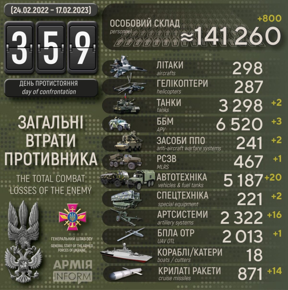 Сили оборони за добу знищили 14 ворожих ракет, 16 артсистем і 800 окупантів800 осіб, 14 крилатих ракет і два танки втратили окупанти в Україні за минулу добу. Крім того, за даними Генерального штабу Збройних сил України, наші захисники також знищили три бойові броньовані машини, 16 артсистем, одну РСЗВ, два засоби ППО, один БПЛА оперативно-тактичного рівня, 20 одиниць автомобільної техніки і дві одиниці спецтехніки. Усього з початку повномасштабного вторгнення втрати ворога склали: особового складу — 141 260 осіб; танків ‒ 3298 одиниць; бойових броньованих машин ‒ 6520 одиниць; артилерійських систем – 2322 одиниці; РСЗВ – 467 одиниць; засоби ППО ‒ 241 одиницю; літаків – 298 одиниць; гелікоптерів – 287 одиниць; БПЛА оперативно-тактичного рівня – 2013; крилаті ракети ‒ 871; кораблі /катери ‒ 18 одиниць; автомобільної техніки та автоцистерн – 5187 одиниць; спеціальна техніка ‒ 221. СМЕРТЬ РОСІЙСЬКИМ ОКУПАНТАМ! Помітили помилку? Виділяйте слова з помилкою та натискайте control-enter |
