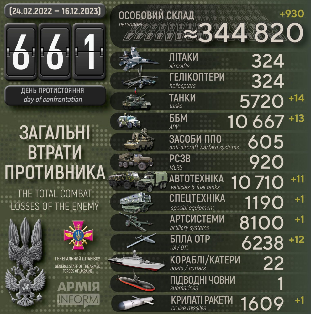 Силы обороны за сутки уничтожили 14 вражеских танков, 13 бронемашин и более 900 оккупантовБолее 900 солдат и офицеров, 14 танков и 13 боевых бронированных машин потеряли российские захватчики за прошедшие сутки. По данным Генерального штаба Вооруженных сил Украины, наши защитники также уничтожили артиллерийскую систему, 12 дронов оперативно-тактического уровня, крылатую ракету, 11 единиц автомобильной техники и единицу спецтехники. Общие боевые потери противника с 24.02.22 по 16.12.23 ориентировочно составляют: личного состава — 344820 (+930) человек ликвидировано танков — 5720 (+14) боевых бронированных машин — 10667 (+13) артиллерийских систем — 8100 (+1) РСЗО — 920 (0) средства ПВО - 605 (0) самолетов — 324 (0) вертолетов — 324 (0) БПЛА оперативно-тактического уровня — 6238 (+12) крылатые ракеты — 1609 (+1) корабли/катера — 22 (0) подводные лодки — 1 (0) автомобильной техники и автоцистерн — 10710 (+11) специальная техника — 1190 (+1) СМЕРТЬ РОССИЙСКИМ ОККУПАНТАМ! Заметили ошибку? Выделяйте слова с ошибкой и нажимайте control-enter |