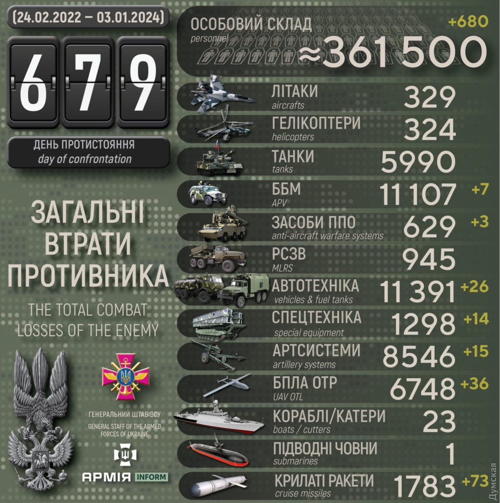 Сили оборони за добу знищили 15 ворожих артсистем, 36 дронів та майже 700 окупантівМайже 700 солдатів і офіцерів, 15 артилерійських систем та 36 дронів оперативно-тактичного рівня втратили російські загарбники минулої доби. За даними Генерального штабу Збройних сил України, наші захисники також знищили 7 бойових броньованих машин, 3 засоби ППО, 73 крилаті ракету, 26 одиниць автомобільної техніки та 14 - спецтехніки. Загальні бойові втрати противника з 24.02.22 по 03.01.24 орієнтовно становлять: особового складу ‒ 361500 (+680) осіб ліквідовано танків ‒ 5990 (0) бойових броньованих машин ‒ 11107 (+7) артилерійських систем ‒ 8546 (+15) РСЗВ ‒ 945 (0) засоби ППО ‒ 629 (+3) літаків ‒ 329 (0) гелікоптерів ‒ 324 (0) БПЛА оперативно-тактичного рівня ‒ 6748 (+36) крилаті ракети ‒ 1783 (+73) кораблі / катери ‒ 23 (0) підводні човни ‒ 1 (0) автомобільної техніки та автоцистерн ‒ 11391 (+26) спеціальна техніка ‒ 1298 (+14) СМЕРТЬ РОСІЙСЬКИМ ОКУПАНТАМ! Помітили помилку? Виділяйте слова з помилкою та натискайте control-enter |