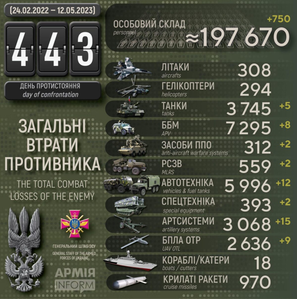 Сили оборони за добу знищили 15 ворожих артсистем, два засоби ППО і 750 окупантів750 осіб, п'ять танків і 15 артсистем втратили окупанти в Україні за минулу добу. Крім того, за даними Генерального штабу Збройних сил України, наші захисники також знищили вісім бойових броньованих машин, дві РСЗВ, два засоби ППО, дев'ять БПЛА оперативно-тактичного рівня, 12 одиниць автомобільної техніки і дві одиниці спецтехніки. Усього з початку повномасштабного вторгнення втрати ворога склали: особового складу — 197 670 осіб; танків ‒ 3745 одиниць; бойових броньованих машин ‒ 7295 одиниць; артилерійських систем – 3068 одиниць; РСЗВ – 559 одиниць; засоби ППО ‒ 312 одиниць; літаків – 308 одиниць; гелікоптерів – 294 одиниці; БПЛА оперативно-тактичного рівня — 2636; крилаті ракети ‒ 970; кораблі /катери ‒ 18 одиниць; автомобільної техніки та автоцистерн – 5996 одиниць; спеціальна техніка ‒ 393. СМЕРТЬ РОСІЙСЬКИМ ОКУПАНТАМ! Помітили помилку? Виділяйте слова з помилкою та натискайте control-enter |