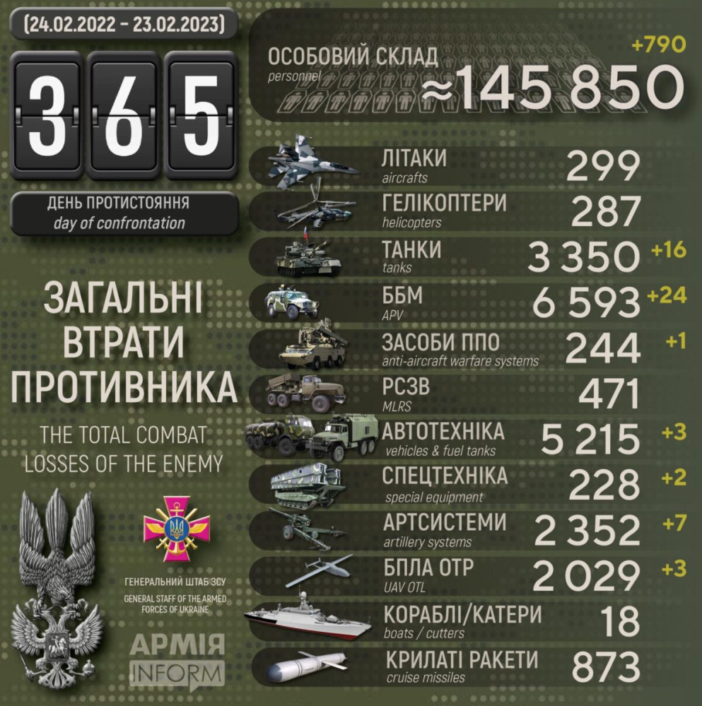 Сили оборони за добу знищили 16 ворожих танків, 24 бронемашини і майже 800 окупантів790 осіб, 16 танків і сім артсистем втратили окупанти в Україні за минулу добу. Крім того, за даними Генерального штабу Збройних сил України, наші захисники також знищили 24 бойові броньовані машини, один засіб ППО, три БПЛА оперативно-тактичного рівня, три одиниці автомобільної техніки і дві одиниці спецтехніки. Усього з початку повномасштабного вторгнення втрати ворога склали: особового складу — 145 850 осіб; танків ‒ 3350 одиниць; бойових броньованих машин ‒ 6593 одиниці; артилерійських систем – 2352 одиниці; РСЗВ – 471 одиницю; засоби ППО ‒ 244 одиниці; літаків – 299 одиниць; гелікоптерів – 287 одиниць; БПЛА оперативно-тактичного рівня – 2029; крилаті ракети ‒ 873; кораблі /катери ‒ 18 одиниць; автомобільної техніки та автоцистерн – 5215 одиниць; спеціальна техніка ‒ 228. СМЕРТЬ РОСІЙСЬКИМ ОКУПАНТАМ! Помітили помилку? Виділяйте слова з помилкою та натискайте control-enter |