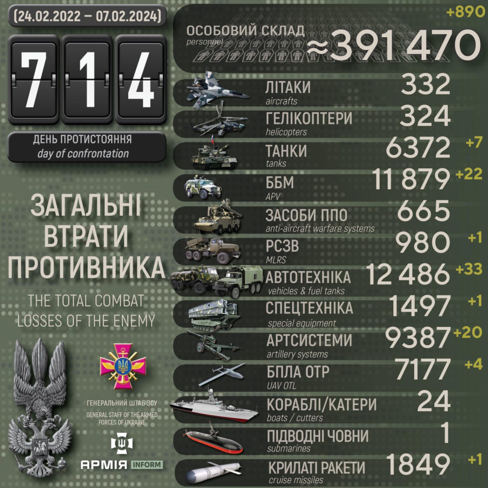 Сили оборони за добу знищили 22 ворожі бронемашини, 20 артсистем і майже 900 окупантівМайже 900 солдатів і офіцерів, 22 бойові броньовані машини та 20 артилерійських систем втратили російські загарбники минулої доби. За даними Генерального штабу Збройних сил України, наші захисники також знищили 7 танків, РСЗВ, 4 дрони оперативно-тактичного рівня, крилату ракету, 33 одиниці автомобільної техніки та одиницю спецтехніки. Загальні бойові втрати противника з 24.02.22 по 07.02.24 орієнтовно становлять: особового складу ‒ 39 1470 (+890) осіб ліквідовано танків ‒ 6372 (+7) бойових броньованих машин ‒ 11 879 (+22) артилерійських систем ‒ 9387 (+20) РСЗВ ‒ 980 (+1) засоби ППО ‒ 665 (0) літаків ‒ 332 (0) гелікоптерів ‒ 324 (0) БПЛА оперативно-тактичного рівня ‒ 7177 (+4) крилаті ракети ‒ 1849 (+1) кораблі / катери ‒ 24 (0) підводні човни ‒ 1 (0) автомобільної техніки та автоцистерн ‒ 12 486 (+33) спеціальна техніка ‒ 1497 (+1) СМЕРТЬ РОСІЙСЬКИМ ОКУПАНТАМ! Помітили помилку? Виділяйте слова з помилкою та натискайте control-enter |