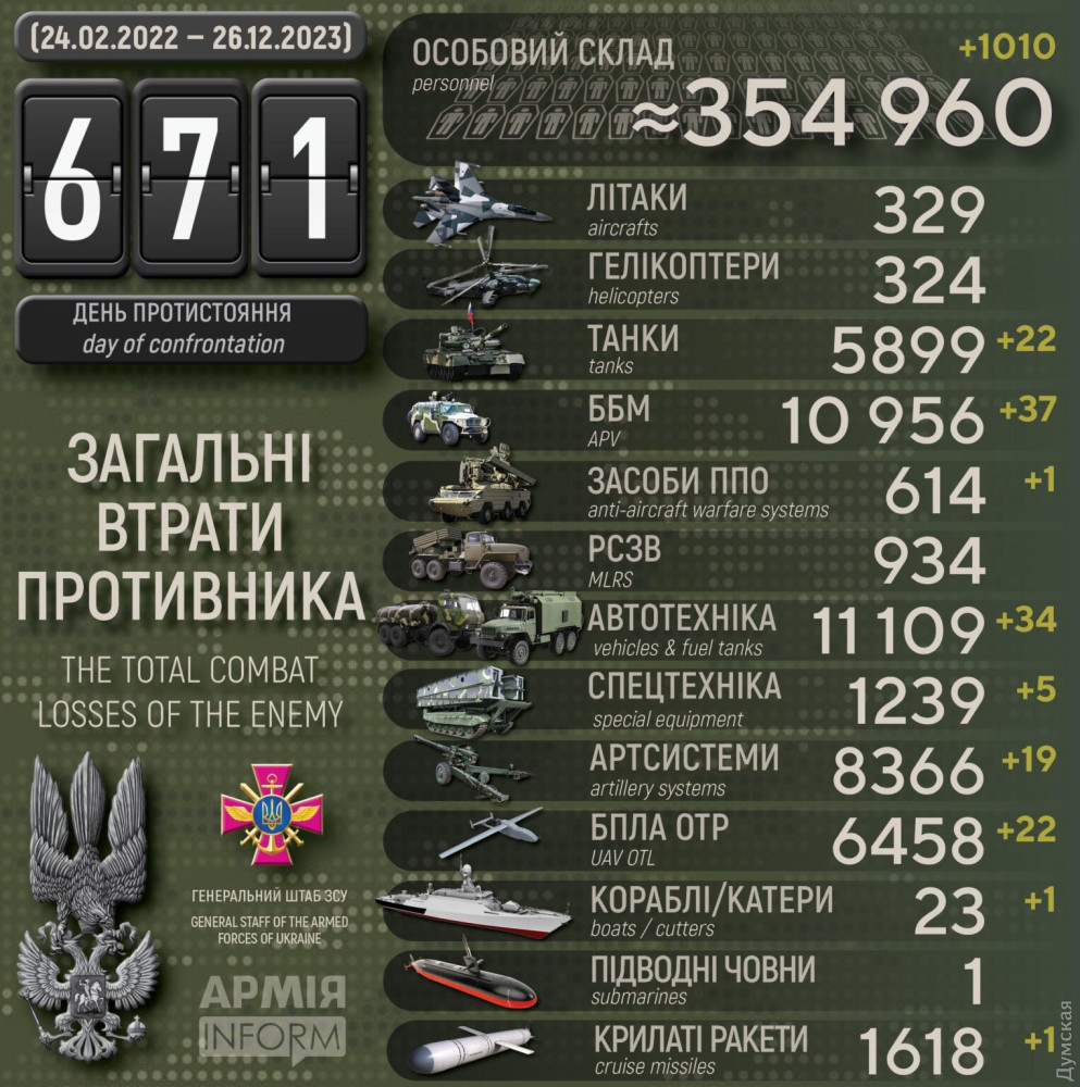 Загальні бойові втрати противника з 24.02.22 по 26.12.23 орієнтовно становлять: