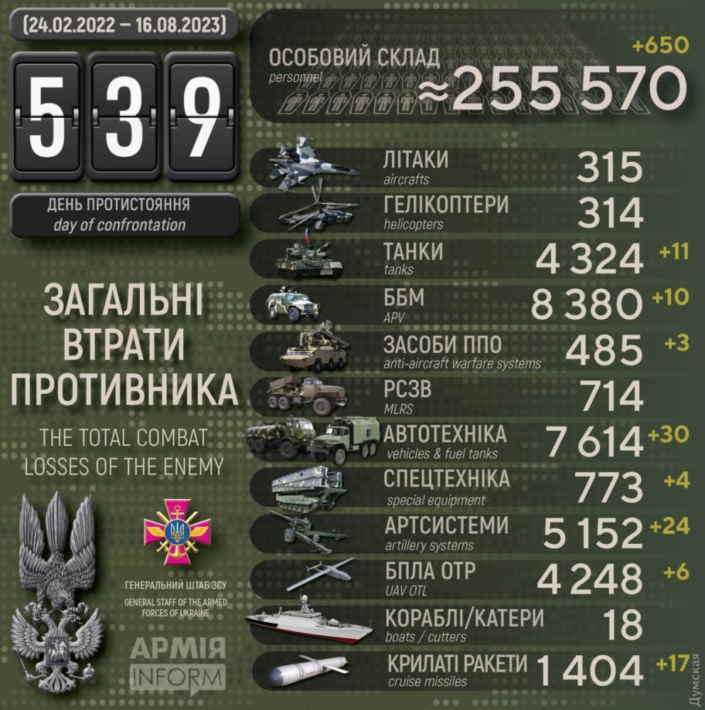 Сили оборони за добу знищили 24 ворожі артсистеми, 17 крилатих ракет і понад 600 окупантів24 ворожі артсистеми, 17 крилатих ракет і 650 військових втратили окупанти в Україні за минулу добу. За даними Генерального штабу Збройних сил України, наші захисники також знищили 11 танків, 10 бойових броньованих машин, три засоби ППО, 6 дронів оперативно-тактичного рівня, 30 одиниць автомобільної техніки та 6 - спецтехніки. Загальні бойові втрати противника з 24.02.22 по 16.08.23 орієнтовно становлять: особового складу ‒ 255570 (+650) осіб ліквідовано танків ‒ 4324 (+11) бойових броньованих машин ‒ 8380 (+10) артилерійських систем ‒ 5152 (+24) РСЗВ ‒ 714 (0) засоби ППО ‒ 485 (+3) літаків ‒ 315 (0) гелікоптерів ‒ 314 (0) БПЛА оперативно-тактичного рівня ‒ 4248 (+6) крилаті ракети ‒ 1404 (+17) кораблі / катери ‒ 18 (0) автомобільної техніки та автоцистерн ‒ 7614 (+30) спеціальна техніка ‒ 773 (+4) СМЕРТЬ РОСІЙСЬКИМ ОКУПАНТАМ! Помітили помилку? Виділяйте слова з помилкою та натискайте control-enter |
