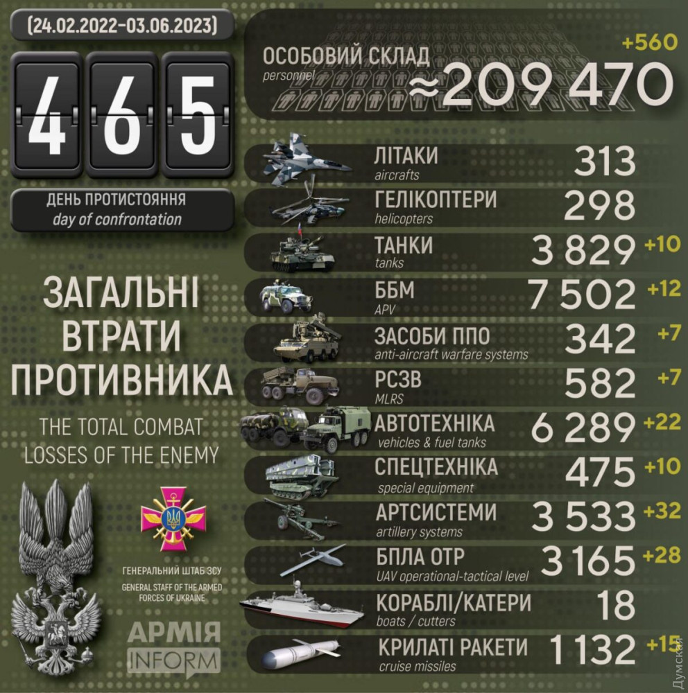Сили оборони за добу знищили 32 артсистеми, 15 крилатих ракет і 560 окупантів560 військових, 32 артсистеми та 15 крилатих ракет втратили окупанти в Україні за минулу добу. Крім того, за даними Генерального штабу Збройних сил України, наші захисники також знищили 10 танків, 12 бойових броньованих машин, сім РСЗВ та стільки ж засобів ППО, 28 безпілотників оперативно-тактичного рівня, 22 одиниці автомобільної техніки і 10 одиниць спецтехніки. Усього з початку повномасштабного вторгнення втрати ворога склали: особового складу ‒ 209470 (+560) осіб ліквідовано танків ‒ 3829 (+10) бойових броньованих машин ‒ 7502 (+12) артилерійських систем ‒ 3533 (+32) РСЗВ ‒ 582 (+7) засоби ППО ‒ 342 (+7) літаків ‒ 313 (0) гелікоптерів ‒ 298 (0) БПЛА оперативно-тактичного рівня ‒ 3165 (+28) крилаті ракети ‒ 1132 (+15) кораблі / катери ‒ 18 (0) автомобільної техніки та автоцистерн ‒ 6289 (+22) спеціальна техніка ‒ 475 (+10) СМЕРТЬ РОСІЙСЬКИМ ОКУПАНТАМ! Помітили помилку? Виділяйте слова з помилкою та натискайте control-enter |