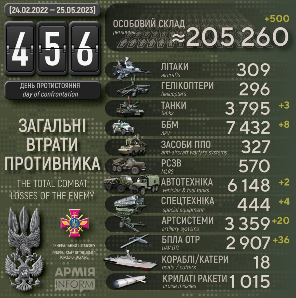 Сили оборони за добу знищили 36 ворожих безпілотників, 20 артсистем і 500 окупантів500 осіб, три танки і 20 артсистем втратили окупанти в Україні за минулу добу. Крім того, за даними Генерального штабу Збройних сил України, наші захисники також знищили вісім бойових броньових машин, 36 БПЛА оперативно-тактичного рівня, дві одиниці автомобільної техніки і чотири одиниці спецтехніки. Усього з початку повномасштабного вторгнення втрати ворога склали: особового складу — 205 260 осіб; танків ‒ 3795 одиниць; бойових броньованих машин ‒ 7432 одиниці; артилерійських систем – 3359 одиниць; РСЗВ – 570 одиниць; засоби ППО ‒ 327 одиниць; літаків – 309 одиниць; гелікоптерів – 296 одиниць; БПЛА оперативно-тактичного рівня – 2907; крилаті ракети ‒ 1015; кораблі /катери ‒ 18 одиниць; автомобільної техніки та автоцистерн – 6148 одиниць; спеціальна техніка ‒ 444. СМЕРТЬ РОСІЙСЬКИМ ОКУПАНТАМ! Помітили помилку? Виділяйте слова з помилкою та натискайте control-enter |