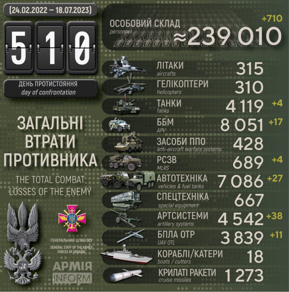 Сили оборони за добу знищили 38 ворожих артсистем і понад 700 окупантів710 осіб, чотири танки і 38 артсистем втратили окупанти в Україні за минулу добу. Крім того, за даними Генерального штабу Збройних сил України, наші захисники також знищили 17 бойових броньованих машин, чотири РСЗВ, 11 БПЛА оперативно-тактичного рівня і 27 одиниць автомобільної техніки. Усього з початку повномасштабного вторгнення втрати ворога склали: особового складу — 239 010 осіб; танків ‒ 4119 одиниць; бойових броньованих машин ‒ 8051 одиницю; артилерійських систем – 4542 одиниці; РСЗВ – 689 одиниць; засоби ППО ‒ 428 одиниць; літаків – 315 одиниць; гелікоптерів – 310 одиниць; БПЛА оперативно-тактичного рівня – 3839; крилаті ракети ‒ 1273; кораблі /катери ‒ 18 одиниць; автомобільної техніки та автоцистерн – 7086 одиниць; спеціальна техніка ‒ 677. СМЕРТЬ РОСІЙСЬКИМ ОКУПАНТАМ! Помітили помилку? Виділяйте слова з помилкою та натискайте control-enter |
